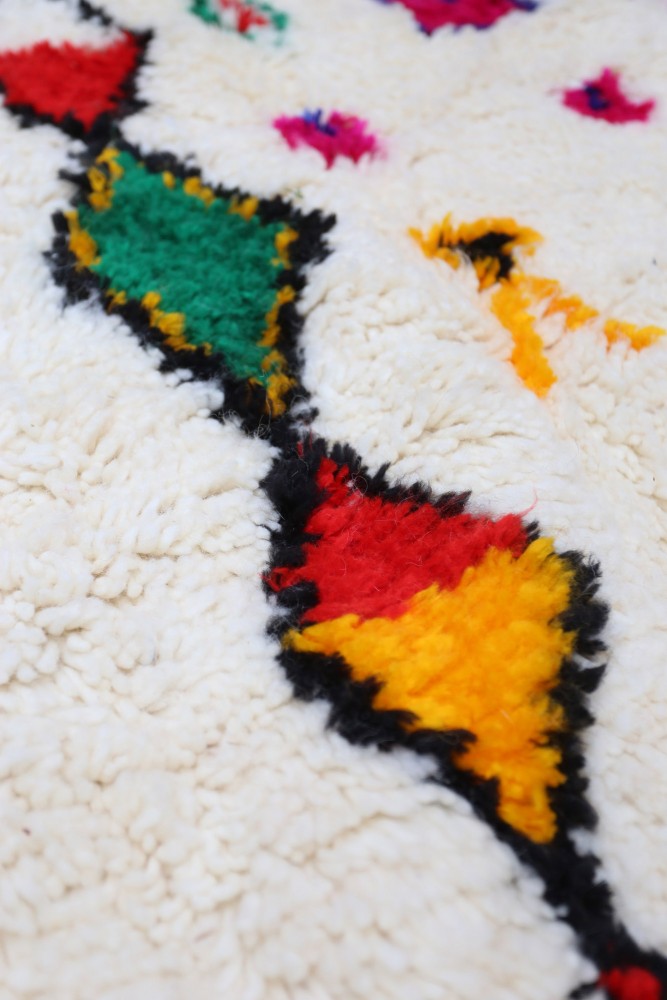 This Berber carpet called Azilal gets its name from the Azilal region in Morocco where it was handcrafted on a traditional wooden loom. Its patterns represent the weaver’s moods, loves, and sorrows at the time of creation. Once this colorful Berber carpet is created, she will make another one entirely different, based on her current emotions. Each piece is therefore unique.