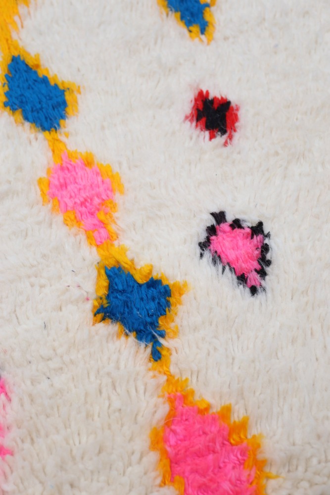 This Berber carpet called Azilal gets its name from the Azilal region in Morocco where it was handcrafted on a traditional wooden loom. Its patterns represent the weaver’s moods, loves, and sorrows at the time of creation. Once this colorful Berber carpet is created, she will make another one entirely different, based on her current emotions. Each piece is therefore unique.