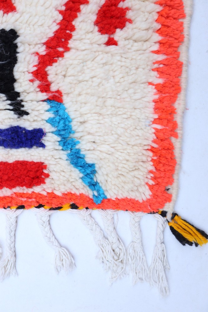This Berber carpet called Azilal gets its name from the Azilal region in Morocco where it was handcrafted on a traditional wooden loom. Its patterns represent the weaver’s moods, loves, and sorrows at the time of creation. Once this colorful Berber carpet is created, she will make another one entirely different, based on her current emotions. Each piece is therefore unique.