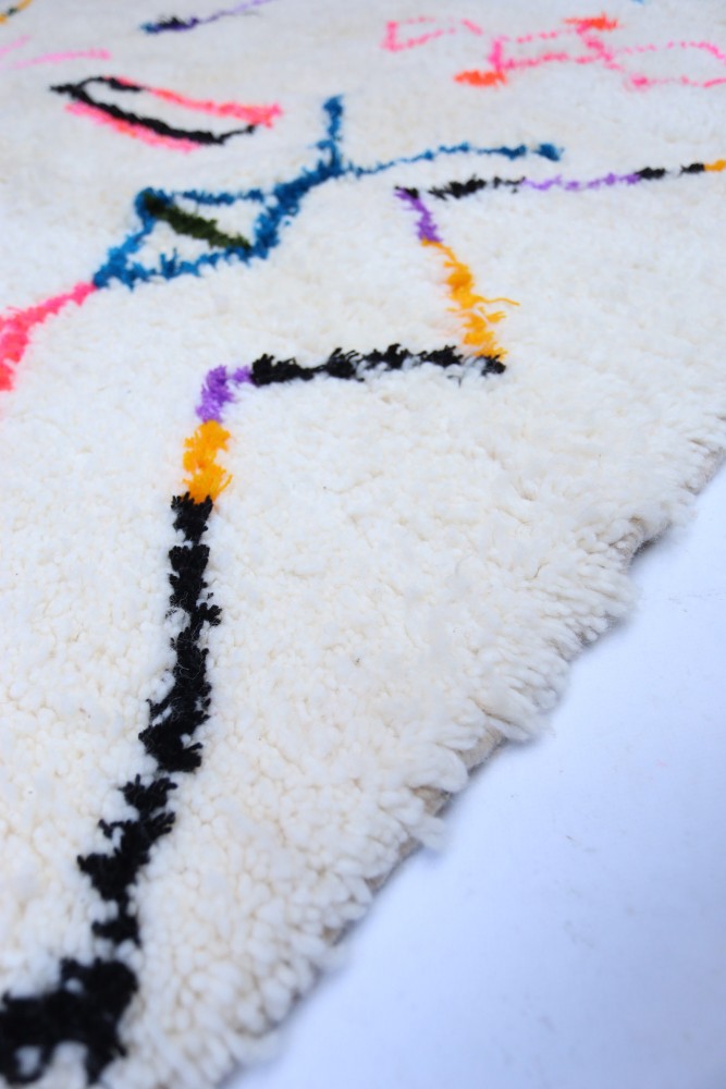 This Berber carpet called Azilal gets its name from the Azilal region in Morocco where it was handcrafted on a traditional wooden loom. Its patterns represent the weaver’s moods, loves, and sorrows at the time of creation. Once this colorful Berber carpet is created, she will make another one entirely different, based on her current emotions. Each piece is therefore unique.