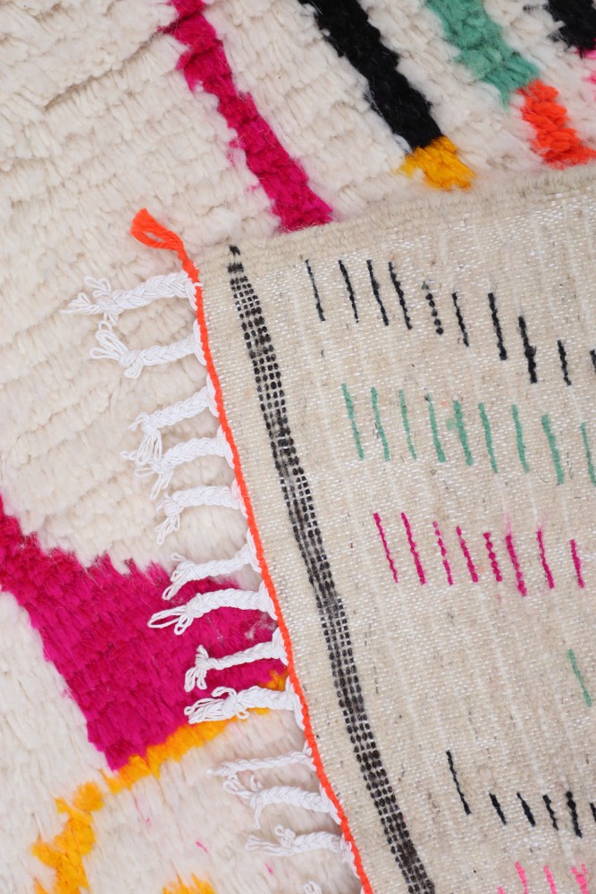 This Berber carpet called Azilal gets its name from the Azilal region in Morocco where it was handcrafted on a traditional wooden loom. Its patterns represent the weaver’s moods, loves, and sorrows at the time of creation. Once this colorful Berber carpet is created, she will make another one entirely different, based on her current emotions. Each piece is therefore unique.
