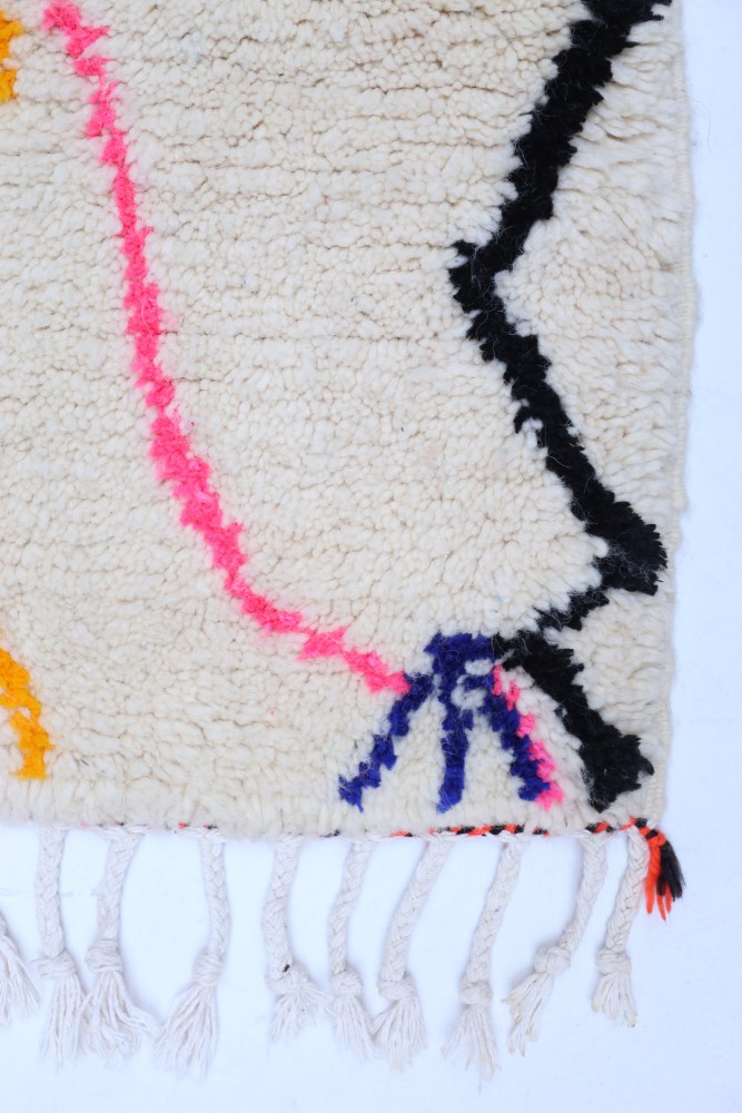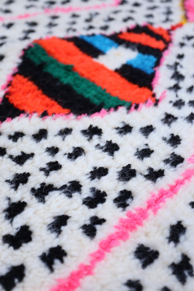 This Berber carpet called Azilal gets its name from the Azilal region in Morocco where it was handcrafted on a traditional wooden loom. Its patterns represent the weaver’s moods, loves, and sorrows at the time of creation. Once this colorful Berber carpet is created, she will make another one entirely different, based on her current emotions. Each piece is therefore unique.