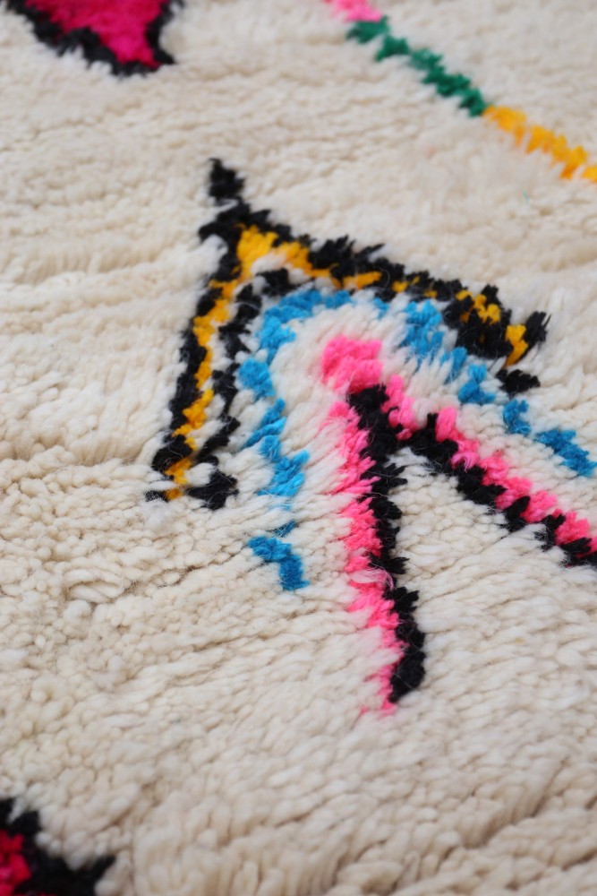 This Berber carpet called Azilal gets its name from the Azilal region in Morocco where it was handcrafted on a traditional wooden loom. Its patterns represent the weaver’s moods, loves, and sorrows at the time of creation. Once this colorful Berber carpet is created, she will make another one entirely different, based on her current emotions. Each piece is therefore unique.