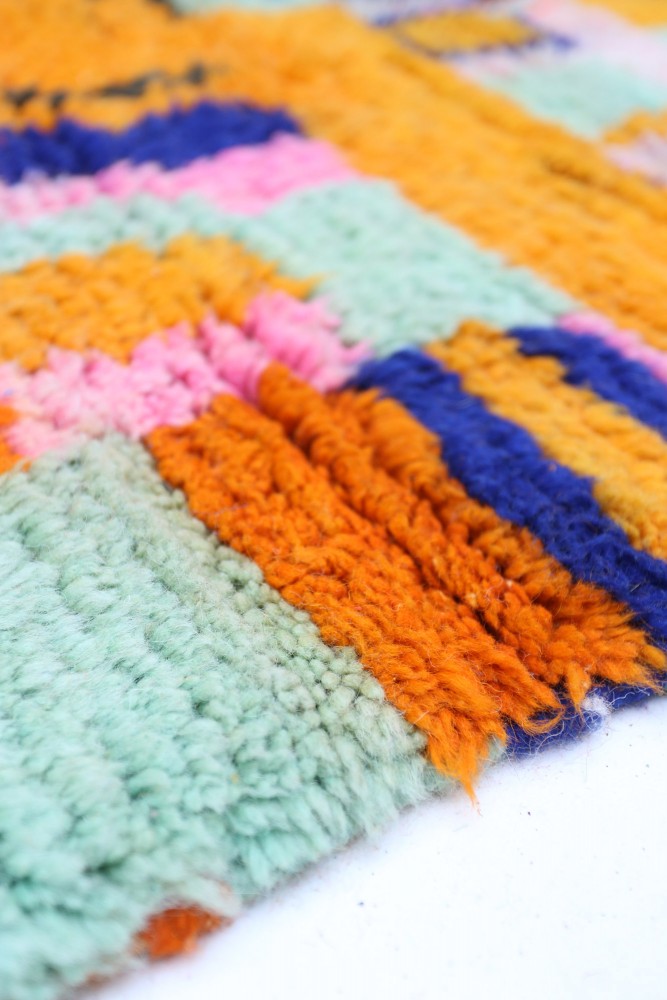 This Berber carpet called Azilal gets its name from the Azilal region in Morocco where it was handcrafted on a traditional wooden loom. Its patterns represent the weaver’s moods, loves, and sorrows at the time of creation. Once this colorful Berber carpet is created, she will make another one entirely different, based on her current emotions. Each piece is therefore unique.