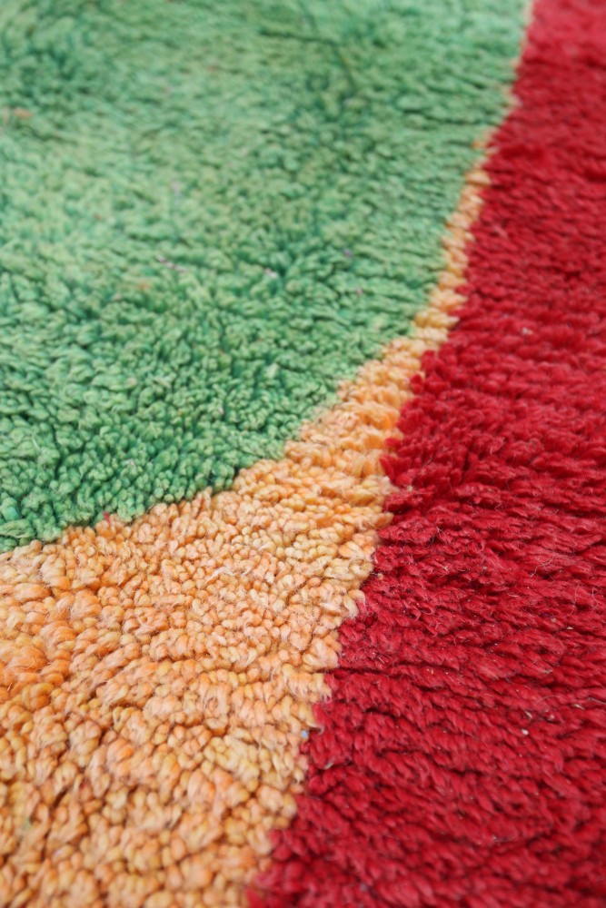This Berber carpet called Azilal gets its name from the Azilal region in Morocco where it was handcrafted on a traditional wooden loom. Its patterns represent the weaver’s moods, loves, and sorrows at the time of creation. Once this colorful Berber carpet is created, she will make another one entirely different, based on her current emotions. Each piece is therefore unique.