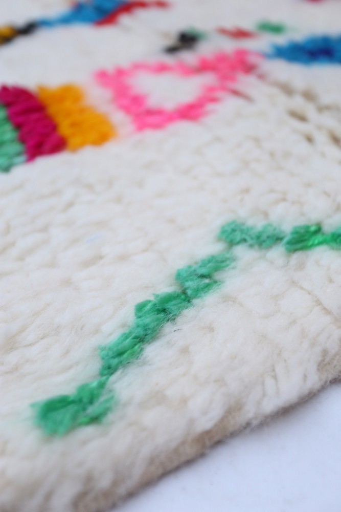 This Berber carpet called Azilal gets its name from the Azilal region in Morocco where it was handcrafted on a traditional wooden loom. Its patterns represent the weaver’s moods, loves, and sorrows at the time of creation. Once this colorful Berber carpet is created, she will make another one entirely different, based on her current emotions. Each piece is therefore unique.