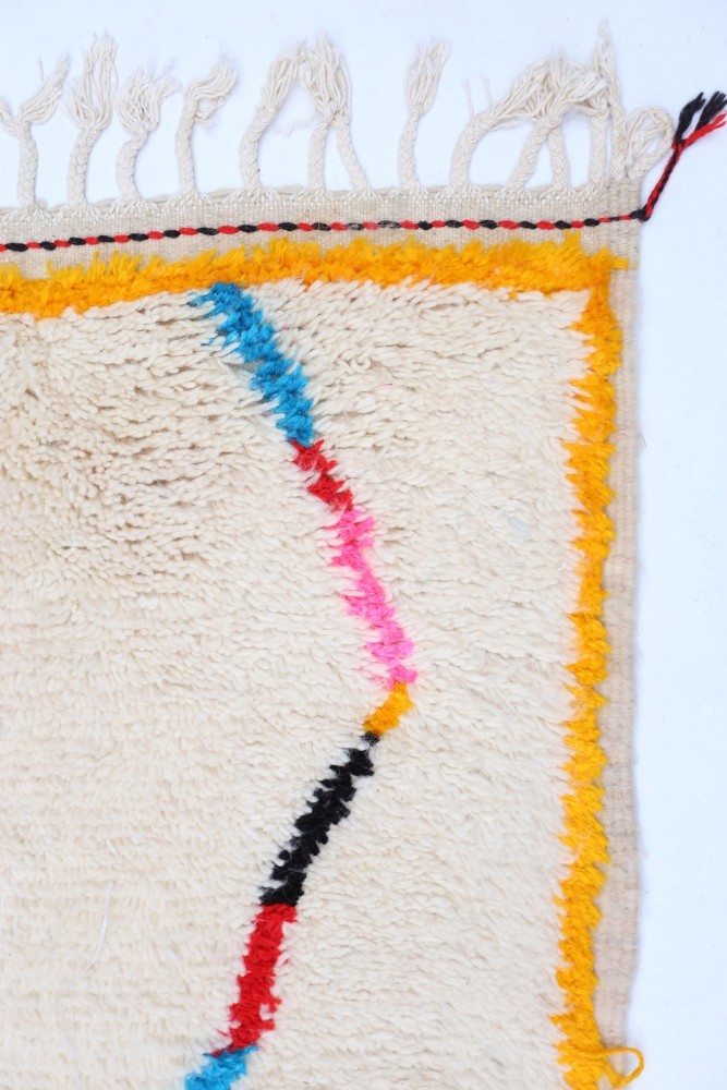 This Berber rug called Azilal gets its name from the Azilal region in Morocco where it was handcrafted on a traditional wooden loom. Its patterns represent the moods, loves, and sorrows of the weaver at the time of its creation. Once this colorful Berber rug is created, she will craft another one completely different, based on her emotions of the moment. Each piece is therefore unique.