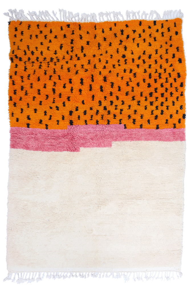 This Berber carpet called Azilal gets its name from the Azilal region in Morocco where it was handcrafted on a traditional wooden loom. Its patterns represent the weaver’s moods, loves, and sorrows at the time of creation. Once this colorful Berber carpet is created, she will make another one entirely different, based on her current emotions. Each piece is therefore unique.