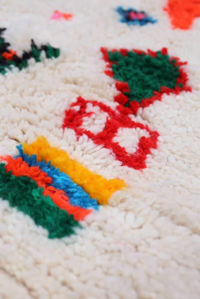 This Berber carpet called Azilal gets its name from the Azilal region in Morocco where it was handcrafted on a traditional wooden loom. Its patterns represent the weaver’s moods, loves, and sorrows at the time of creation. Once this colorful Berber carpet is created, she will make another one entirely different, based on her current emotions. Each piece is therefore unique.