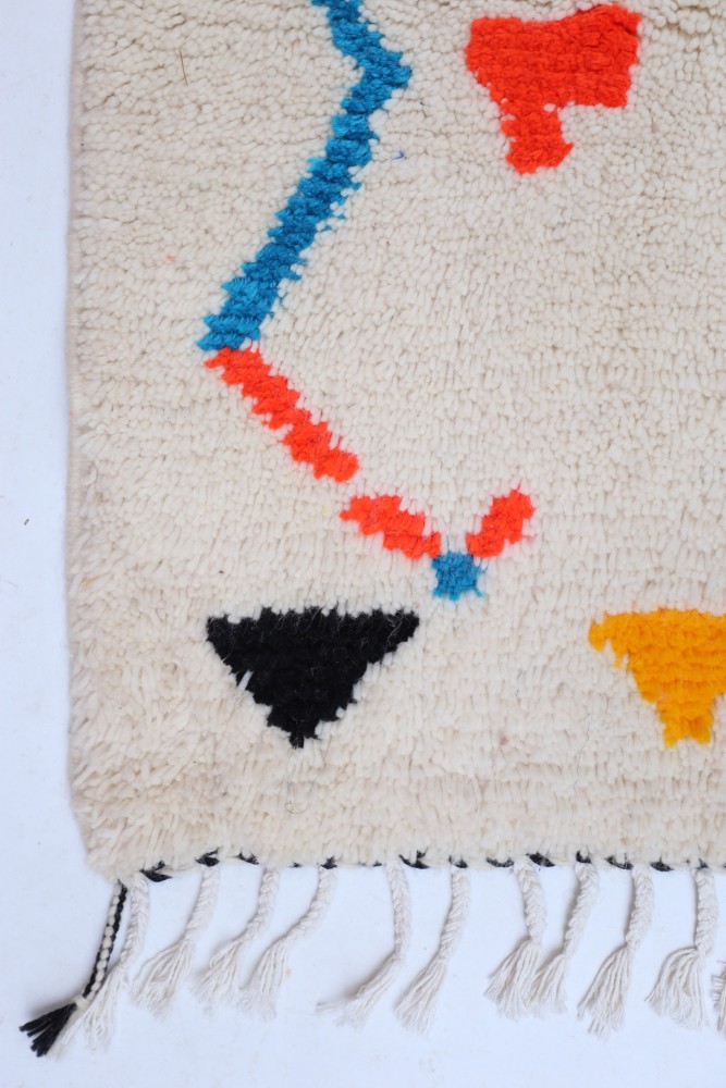This Berber carpet called Azilal gets its name from the Azilal region in Morocco where it was handcrafted on a traditional wooden loom. Its patterns represent the weaver’s moods, loves, and sorrows at the time of creation. Once this colorful Berber carpet is created, she will make another one entirely different, based on her current emotions. Each piece is therefore unique.