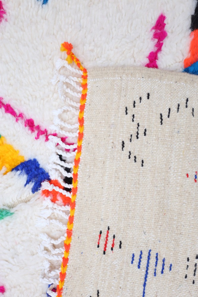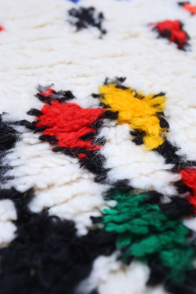 This Berber carpet called Azilal gets its name from the Azilal region in Morocco where it was handcrafted on a traditional wooden loom. Its patterns represent the weaver’s moods, loves, and sorrows at the time of creation. Once this colorful Berber carpet is created, she will make another one entirely different, based on her current emotions. Each piece is therefore unique.