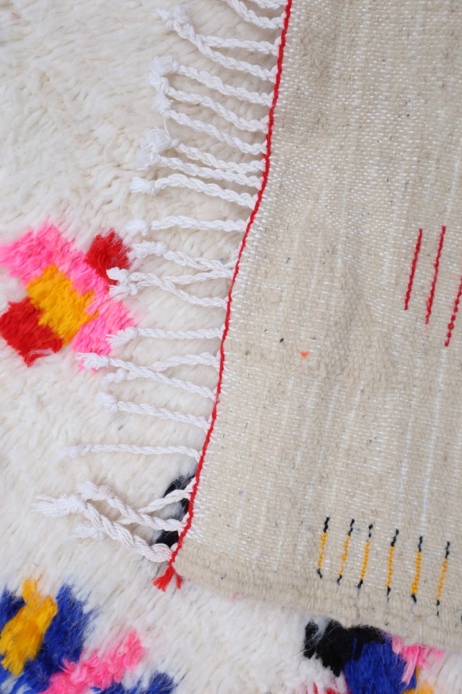 This Berber carpet called Azilal gets its name from the Azilal region in Morocco where it was handcrafted on a traditional wooden loom. Its patterns represent the weaver’s moods, loves, and sorrows at the time of creation. Once this colorful Berber carpet is created, she will make another one entirely different, based on her current emotions. Each piece is therefore unique.