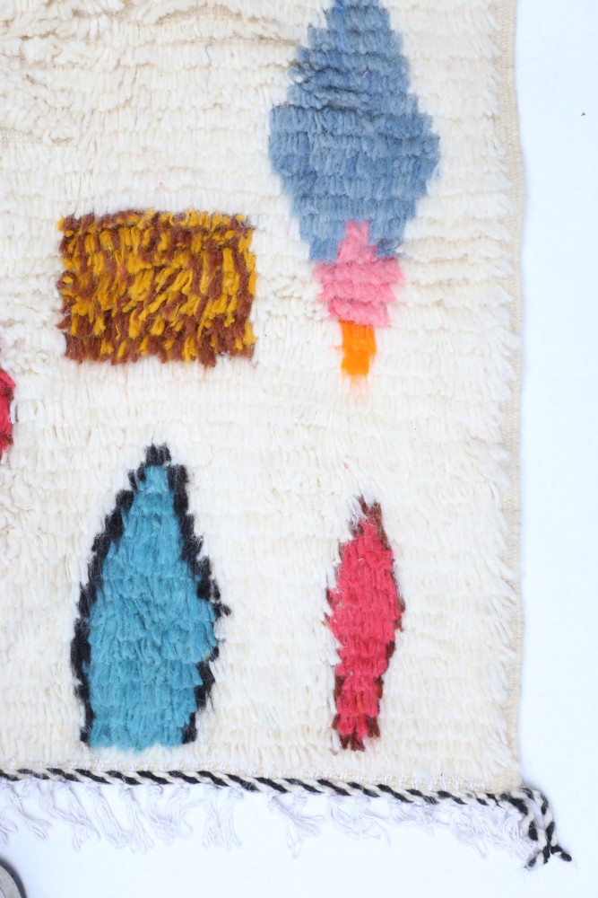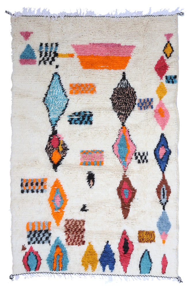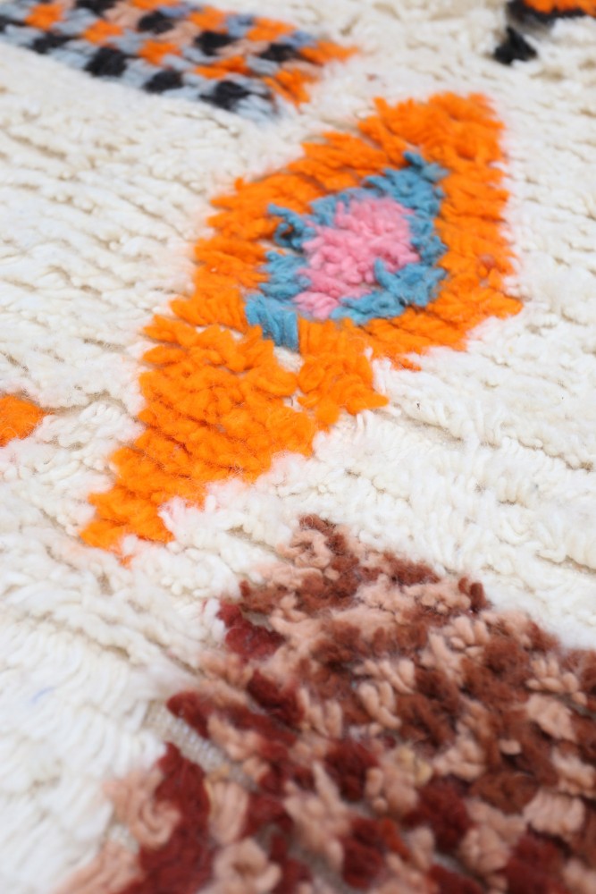 This Berber carpet called Azilal gets its name from the Azilal region in Morocco where it was handcrafted on a traditional wooden loom. Its patterns represent the weaver’s moods, loves, and sorrows at the time of creation. Once this colorful Berber carpet is created, she will make another one entirely different, based on her current emotions. Each piece is therefore unique.