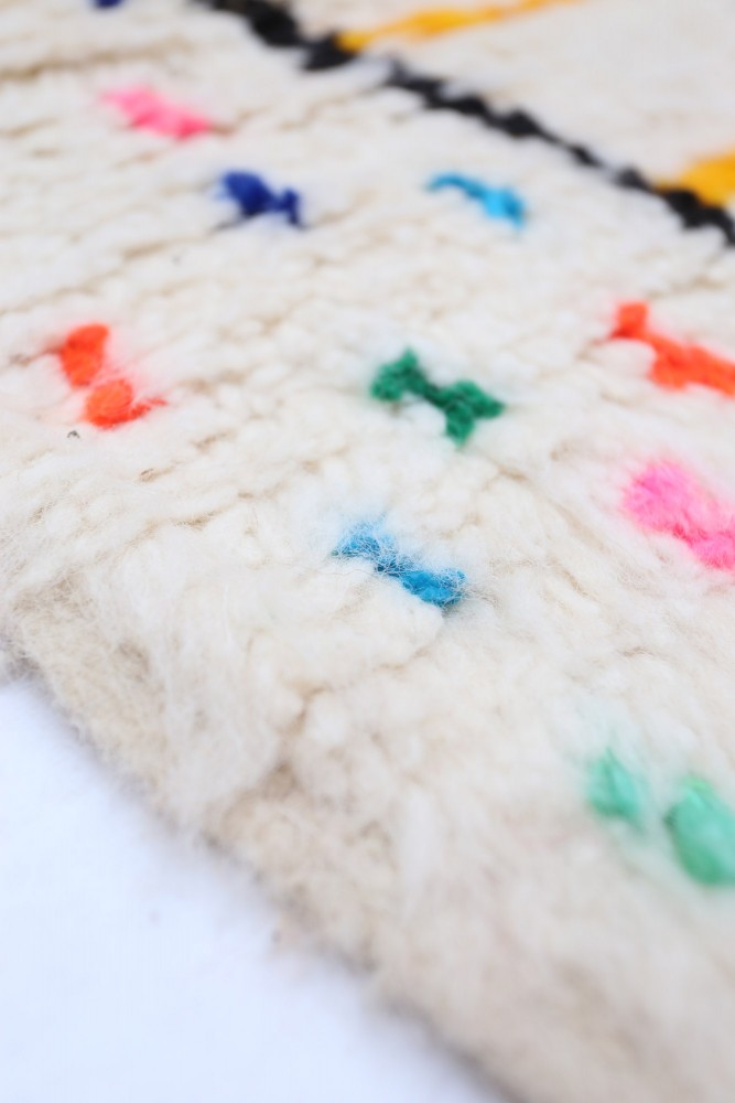 This Berber carpet called Azilal gets its name from the Azilal region in Morocco where it was handcrafted on a traditional wooden loom. Its patterns represent the weaver’s moods, loves, and sorrows at the time of creation. Once this colorful Berber carpet is created, she will make another one entirely different, based on her current emotions. Each piece is therefore unique.