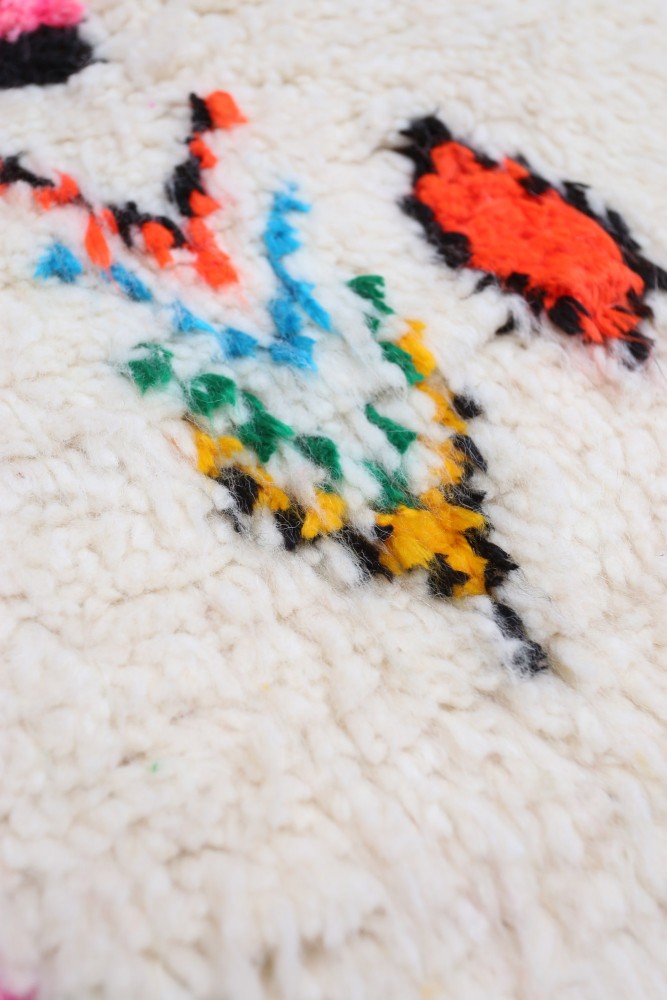 This Berber carpet called Azilal gets its name from the Azilal region in Morocco where it was handcrafted on a traditional wooden loom. Its patterns represent the weaver’s moods, loves, and sorrows at the time of creation. Once this colorful Berber carpet is created, she will make another one entirely different, based on her current emotions. Each piece is therefore unique.