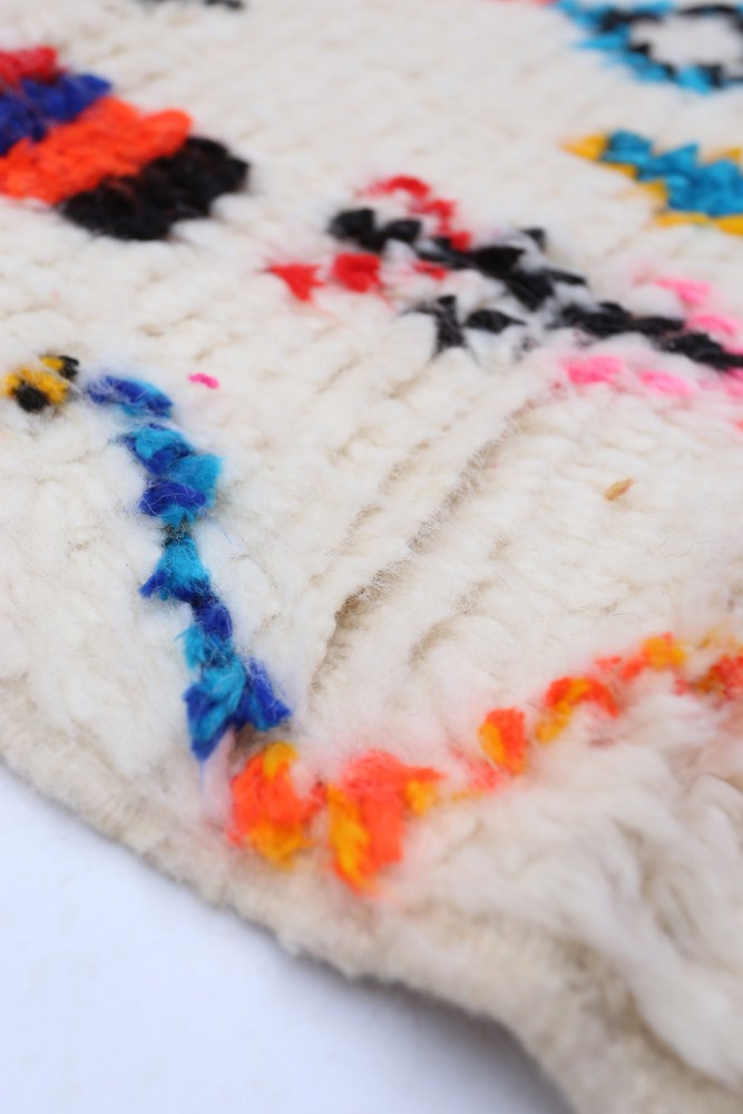 This Berber carpet called Azilal gets its name from the Azilal region in Morocco where it was handcrafted on a traditional wooden loom. Its patterns represent the weaver’s moods, loves, and sorrows at the time of creation. Once this colorful Berber carpet is created, she will make another one entirely different, based on her current emotions. Each piece is therefore unique.
