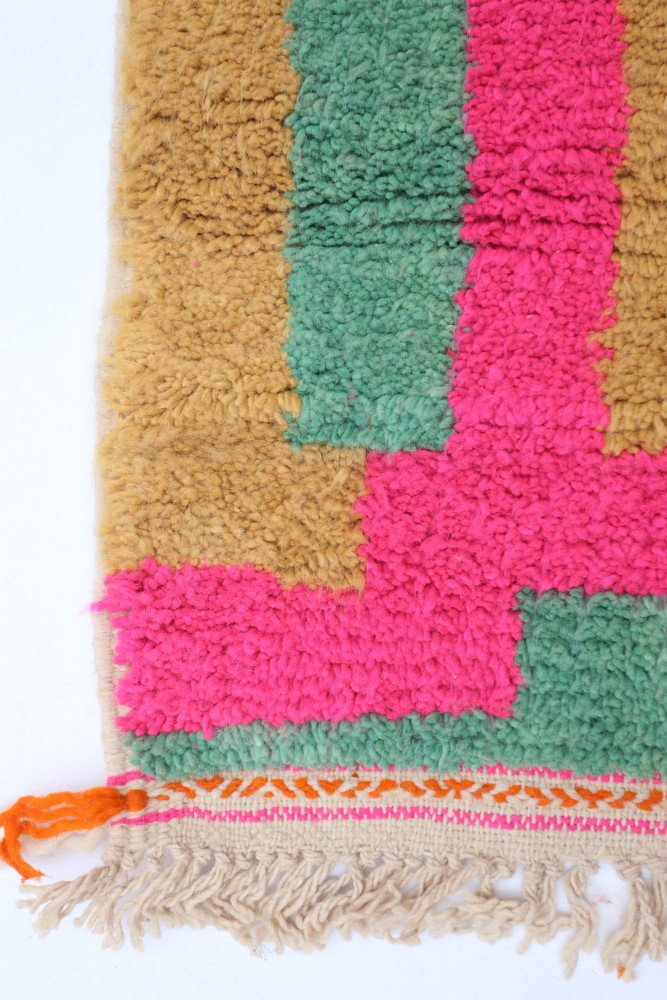 This Berber carpet called Azilal gets its name from the Azilal region in Morocco where it was handcrafted on a traditional wooden loom. Its patterns represent the weaver’s moods, loves, and sorrows at the time of creation. Once this colorful Berber carpet is created, she will make another one entirely different, based on her current emotions. Each piece is therefore unique.