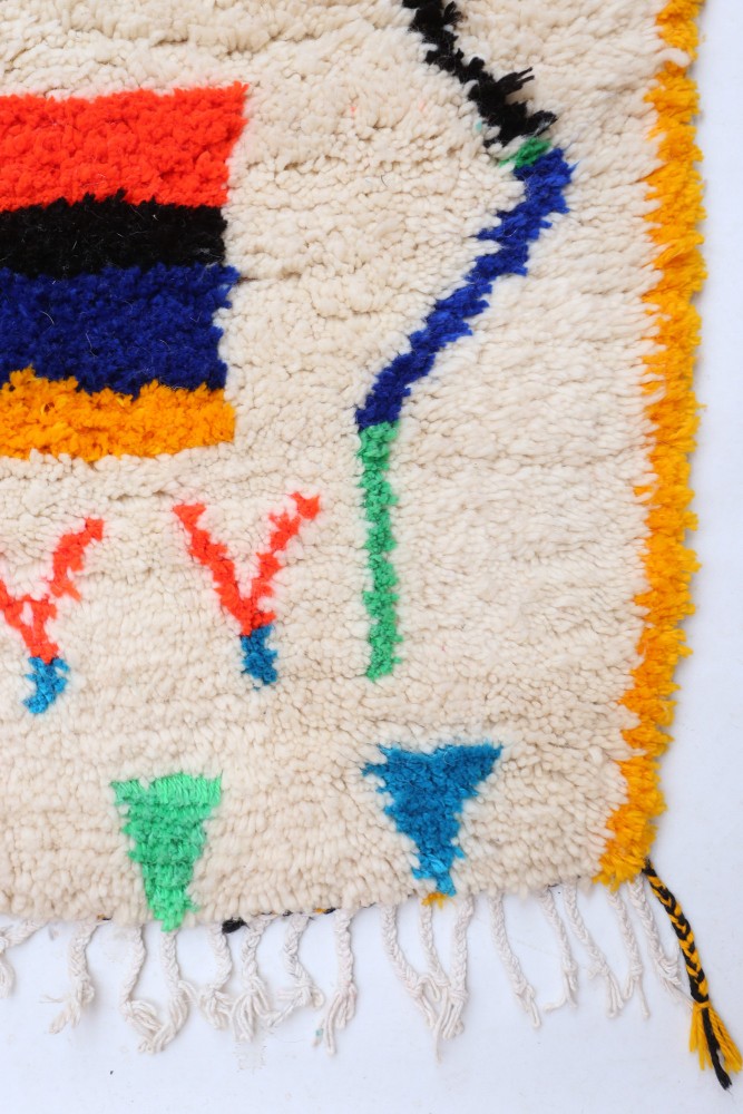 This Berber carpet called Azilal gets its name from the Azilal region in Morocco where it was handcrafted on a traditional wooden loom. Its patterns represent the weaver’s moods, loves, and sorrows at the time of creation. Once this colorful Berber carpet is created, she will make another one entirely different, based on her current emotions. Each piece is therefore unique.