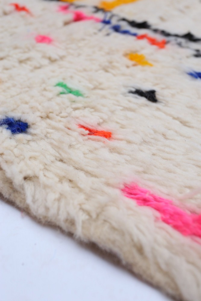 This Berber carpet called Azilal gets its name from the Azilal region in Morocco where it was handcrafted on a traditional wooden loom. Its patterns represent the weaver’s moods, loves, and sorrows at the time of creation. Once this colorful Berber carpet is created, she will make another one entirely different, based on her current emotions. Each piece is therefore unique.