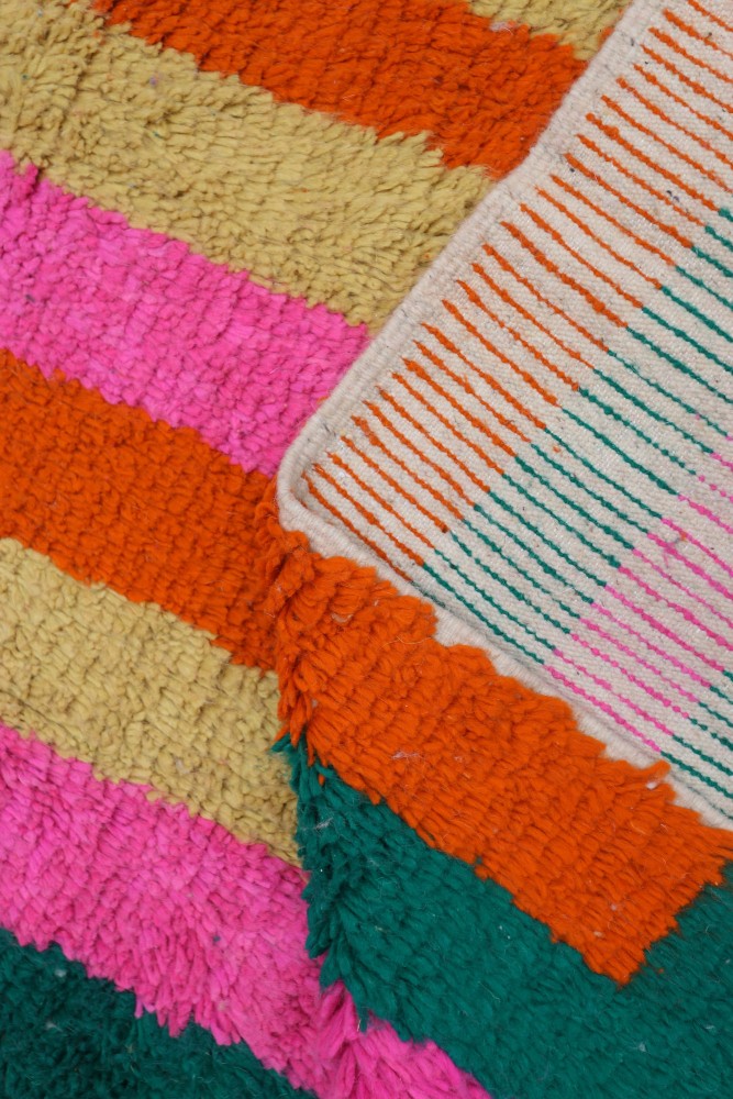This Berber carpet called Azilal gets its name from the Azilal region in Morocco where it was handcrafted on a traditional wooden loom. Its patterns represent the weaver’s moods, loves, and sorrows at the time of creation. Once this colorful Berber carpet is created, she will make another one entirely different, based on her current emotions. Each piece is therefore unique.