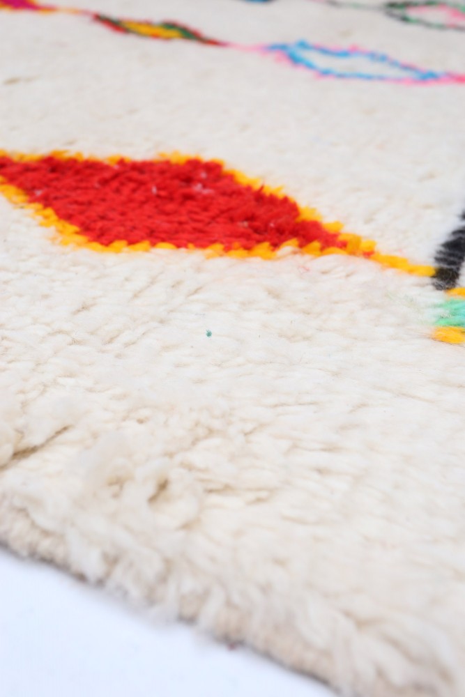 This Berber carpet called Azilal gets its name from the Azilal region in Morocco where it was handcrafted on a traditional wooden loom. Its patterns represent the weaver’s moods, loves, and sorrows at the time of creation. Once this colorful Berber carpet is created, she will make another one entirely different, based on her current emotions. Each piece is therefore unique.