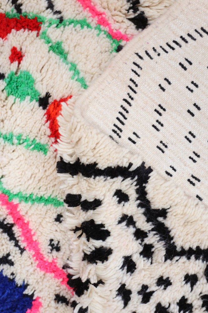 This Berber carpet called Azilal gets its name from the Azilal region in Morocco where it was handcrafted on a traditional wooden loom. Its patterns represent the weaver’s moods, loves, and sorrows at the time of creation. Once this colorful Berber carpet is created, she will make another one entirely different, based on her current emotions. Each piece is therefore unique.