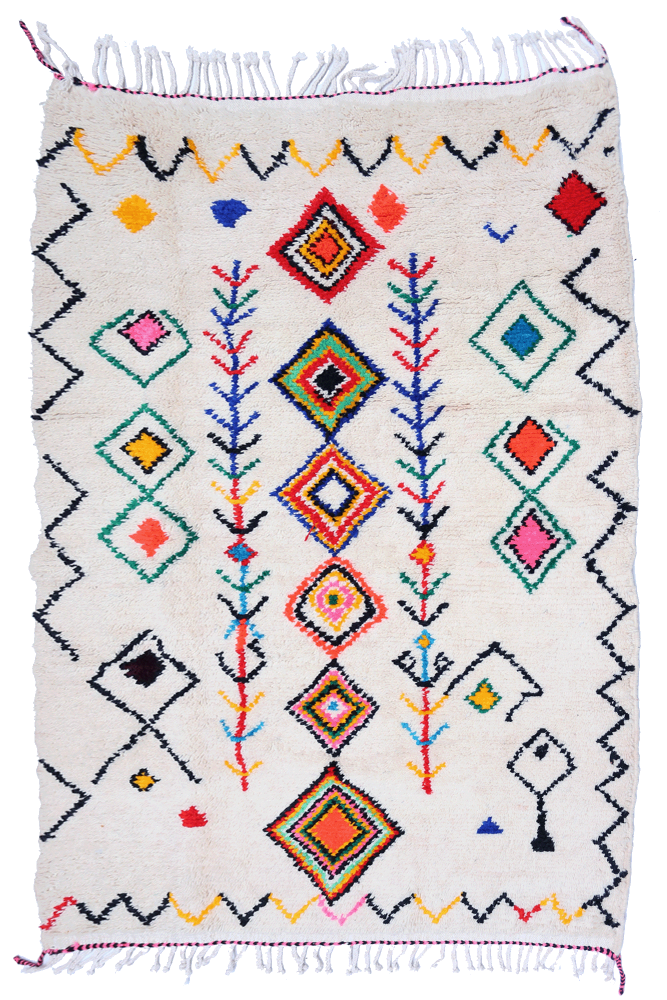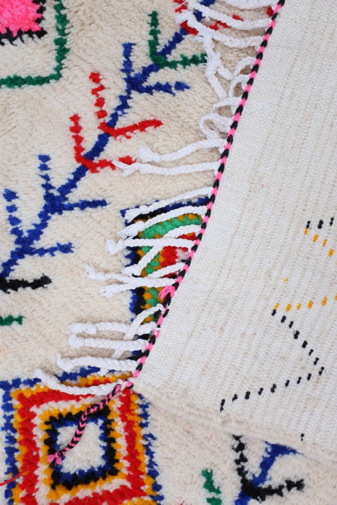 This Berber rug called Azilal gets its name from the Azilal region in Morocco where it was handcrafted on a traditional wooden loom. Its patterns represent the moods, loves, and sorrows of the weaver at the time of its creation. Once this colorful Berber rug is created, she will craft another one completely different, based on her emotions of the moment. Each piece is therefore unique.