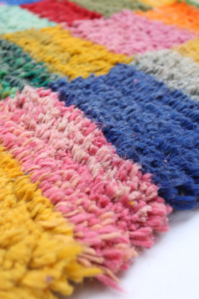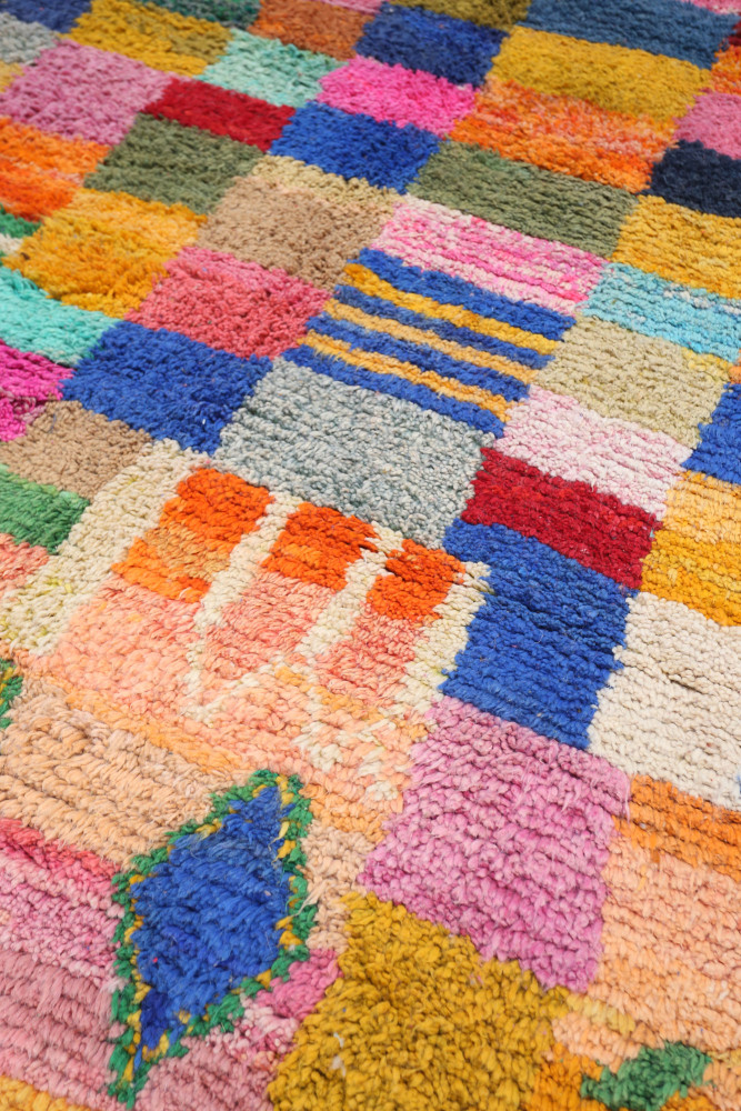 This Berber carpet called Azilal gets its name from the Azilal region in Morocco where it was handcrafted on a traditional wooden loom. Its patterns represent the weaver’s moods, loves, and sorrows at the time of creation. Once this colorful Berber carpet is created, she will make another one entirely different, based on her current emotions. Each piece is therefore unique.