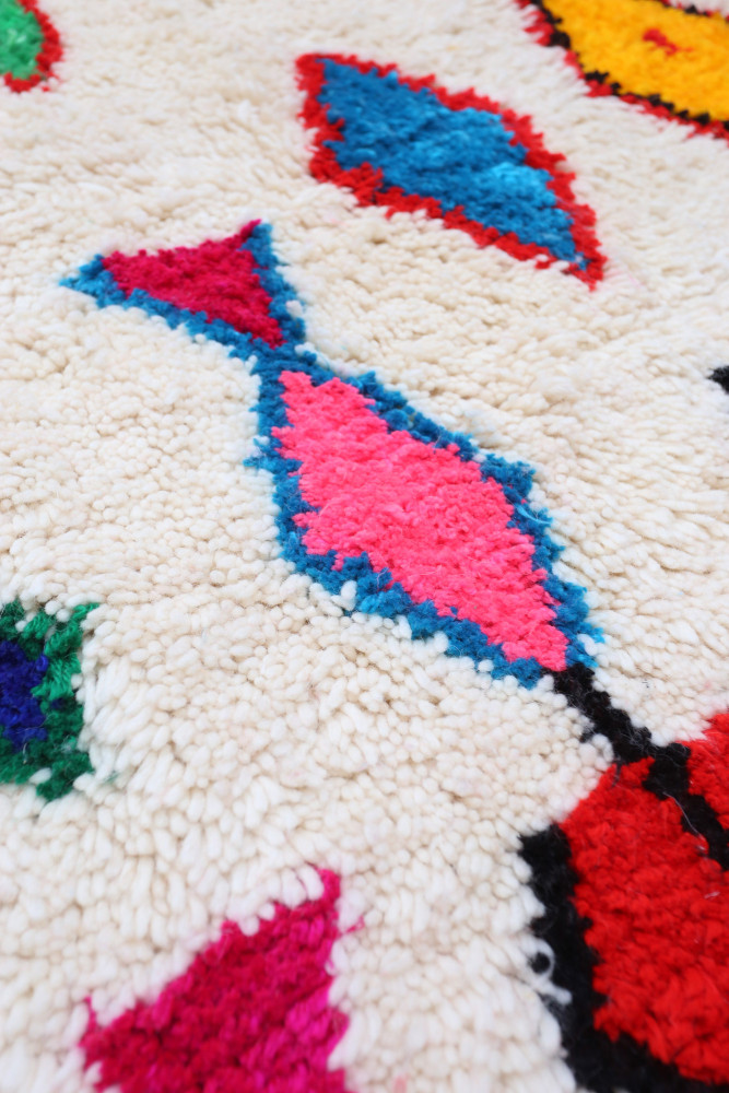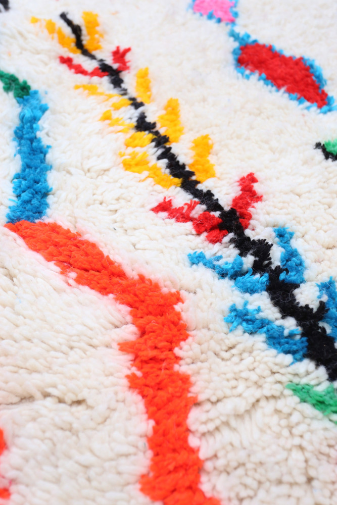 This Berber carpet called Azilal gets its name from the Azilal region in Morocco where it was handcrafted on a traditional wooden loom. Its patterns represent the weaver’s moods, loves, and sorrows at the time of creation. Once this colorful Berber carpet is created, she will make another one entirely different, based on her current emotions. Each piece is therefore unique.