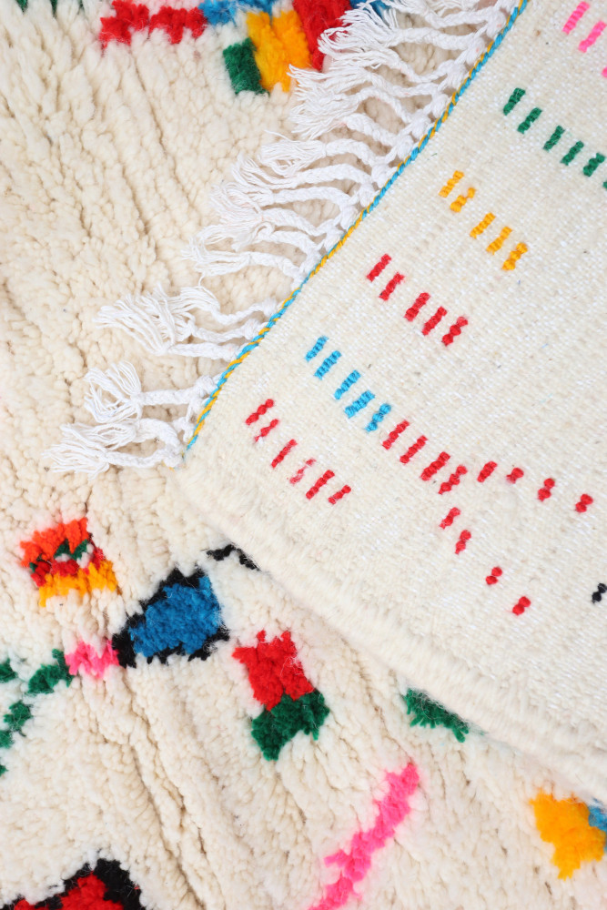 This Berber carpet called Azilal gets its name from the Azilal region in Morocco where it was handcrafted on a traditional wooden loom. Its patterns represent the weaver’s moods, loves, and sorrows at the time of creation. Once this colorful Berber carpet is created, she will make another one entirely different, based on her current emotions. Each piece is therefore unique.