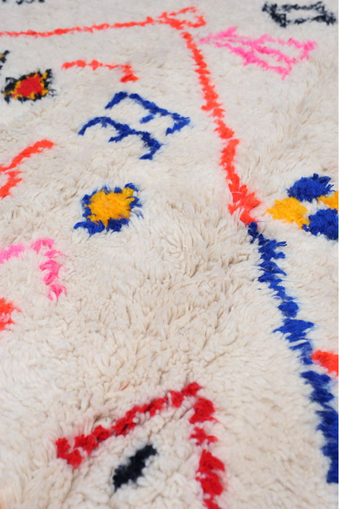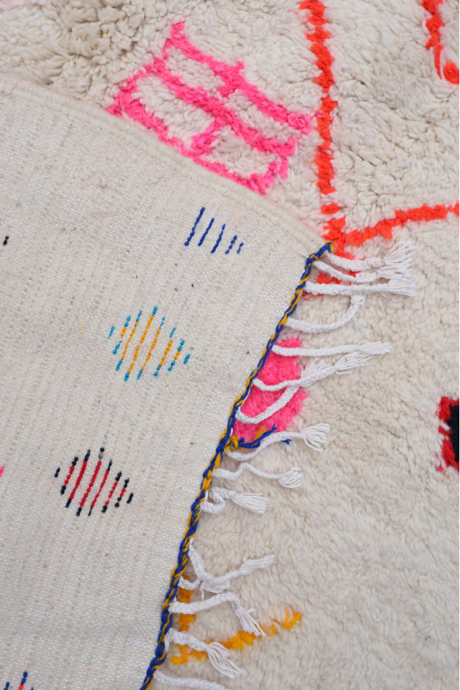 This Berber carpet called Azilal gets its name from the Azilal region in Morocco where it was handcrafted on a traditional wooden loom. Its patterns represent the weaver’s moods, loves, and sorrows at the time of creation. Once this colorful Berber carpet is created, she will make another one entirely different, based on her current emotions. Each piece is therefore unique.