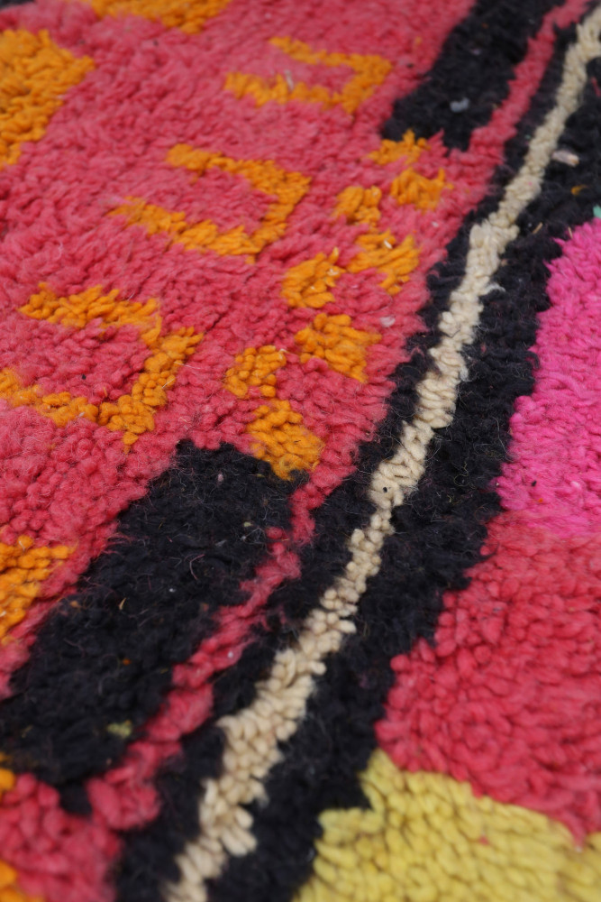 This Berber carpet called Azilal gets its name from the Azilal region in Morocco where it was handcrafted on a traditional wooden loom. Its patterns represent the weaver’s moods, loves, and sorrows at the time of creation. Once this colorful Berber carpet is created, she will make another one entirely different, based on her current emotions. Each piece is therefore unique.