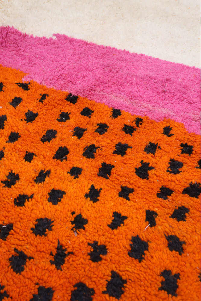 This Berber carpet called Azilal gets its name from the Azilal region in Morocco where it was handcrafted on a traditional wooden loom. Its patterns represent the weaver’s moods, loves, and sorrows at the time of creation. Once this colorful Berber carpet is created, she will make another one entirely different, based on her current emotions. Each piece is therefore unique.