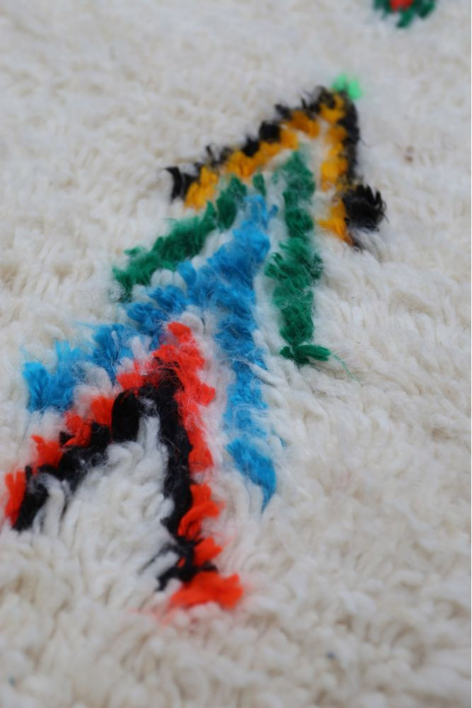 This Berber carpet called Azilal gets its name from the Azilal region in Morocco where it was handcrafted on a traditional wooden loom. Its designs represent the weaver's moods, loves, and sorrows at the time of creation. Once this colorful Berber carpet is crafted, she will create another one completely different, based on her current emotions. Each piece is therefore unique. This Berber carpet represents over a month of weaving. Watch a video on how THEM Berber carpets are created by clicking here. Our carpets with a white background and colorful designs always have a white wool background. The colors can be either cotton or wool. The very bright colors are generally cotton, while the colors with a more natural look are wool. Our fully colored carpets are 100% wool. DELIVERY All packages are sent from France. No customs fees are expected for orders placed in a European Union country. For orders placed in a non-EU country, customs fees may apply. We deliver worldwide, and all orders are shipped every 7 to 15 days. For France: you can choose delivery to a pickup point with Mondial Relay or home delivery with Colissimo. For the rest of the world: the delivery cost varies by country. Just add the carpet to your cart, enter your address, and the delivery cost will be precisely indicated. RETURN You have a 14-day withdrawal period from the delivery of your package to request an exchange, credit, or refund. For France: - If you want an exchange/credit: everything is free (return and delivery of the new package are at our expense) - If you want a refund: the return is at your expense For the rest of the world: - If you want an exchange: the return of the package is at your expense and the delivery of the new package is at our expense - If you want a refund: the return is at your expense Surprisingly, Berber carpets are easy to maintain. Keep in mind that these historically rich pieces are not primarily meant as decorative objects. Berber women weave and use them as blankets or rugs for insulation. The exceptional quality of the weaving allows Berber carpets to withstand the test of time and age very well. To maintain it, you can vacuum it once a week at most to avoid damaging the wool. If you can't shake it, turn it over for a few hours once a month, and all deep-seated dust will fall out. In case of a stain, gently pat it with a cloth dampened with water; often, this is sufficient. Otherwise, add some alcohol vinegar or Marseille soap with plenty of water.Learn more