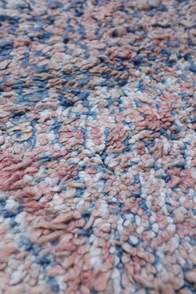 This Berber carpet called Azilal gets its name from the Azilal region in Morocco where it was handcrafted on a traditional wooden loom. Its patterns represent the weaver’s moods, loves, and sorrows at the time of creation. Once this colorful Berber carpet is created, she will make another one entirely different, based on her current emotions. Each piece is therefore unique.