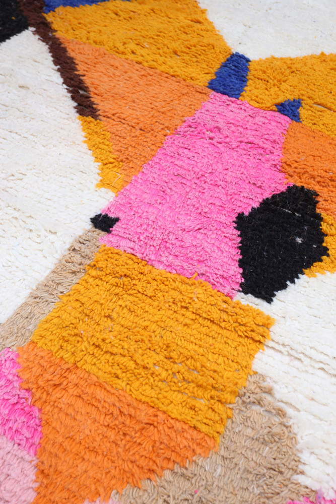 This Berber carpet called Azilal gets its name from the Azilal region in Morocco where it was handcrafted on a traditional wooden loom. Its patterns represent the weaver’s moods, loves, and sorrows at the time of creation. Once this colorful Berber carpet is created, she will make another one entirely different, based on her current emotions. Each piece is therefore unique. This Berber carpet represents over a month of weaving. Watch a video on how THEM Berber carpets are created by clicking here. Our carpets with a white background and colorful designs always have a white wool background. The colors can be either cotton or wool. The very bright colors are usually cotton, and the colors that have a more natural look are wool. Our completely colorful carpets are all 100% wool. DELIVERY All packages are sent from France. No customs fees for orders placed in a European Union country. For orders placed in a non-EU country, customs fees may apply. We ship worldwide, and all orders are shipped every 7 to 15 days. For France: you can choose delivery to a pickup point with Mondial Relay or home delivery with Colissimo. For the rest of the world: the delivery cost varies by country. Simply add the carpet to your cart, enter your address, and the delivery cost will be precisely indicated. RETURNS You have a 14-day cooling-off period from the delivery of your package to request an exchange, credit, or refund. For France: - If you want an exchange/credit: it's all free (return and delivery of the new package are at our expense) - If you want a refund: the return is at your expense For the rest of the world: - If you want an exchange: the return of the package is at your expense, and the delivery of the new package is at our expense - If you want a refund: the return is at your expense Surprisingly, Berber carpets are easy to maintain. Keep in mind that these historically significant pieces are not primarily intended as decorative items. Berber women weave and use them as blankets or rugs for insulation. The exceptional quality of the weaving allows Berber carpets to withstand time and age very well. To maintain it, you can vacuum it once a week at most to avoid agitating the wool. If you can't shake it, turn it over for a few hours once a month to let all the deep-seated dust fall out. In case of a stain, pat it immediately with a cloth soaked in water, often that will be enough. Otherwise, add some rubbing alcohol or Marseille soap with plenty of water.Learn more
