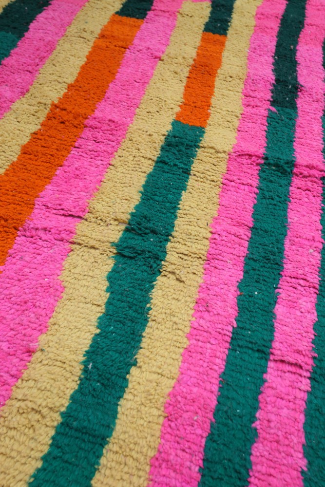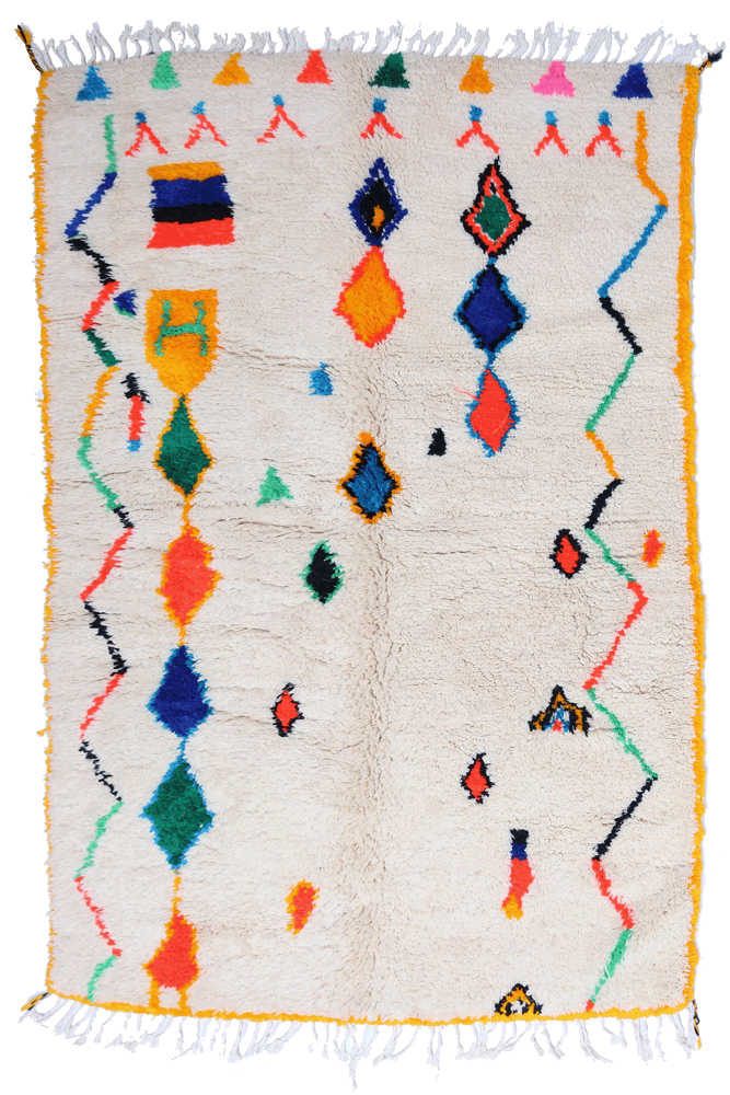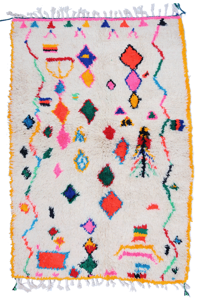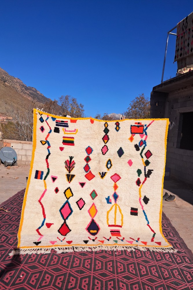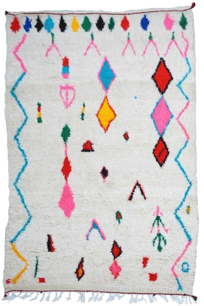 Alfombra Azilal, , alfombra Béni Ouarain, , alfombra Boucherouite, , alfombra Boujad o todavía Kilim es una variedad de alfombra de lana o algodón de origen turco que se caracteriza por sus diseños geométricos y colores brillantes. cada tribu tiene sus propias características y es reconocible por los colores, técnicas o patrones utilizados. En un interior clásico y moderno, una gran alfombra bereber da un resultado cautivador. Embellece los muebles de acero o madera oscura con una belleza atemporal. Los amantes de interiores más simples y sobrios quedarán seducidos por los... alfombra beige Gris suave o con algunos motivos coloridos o negros. Es ideal para crear un ambiente natural y armonioso. ¿Quieres darle un toque de energía y fantasía? Déjate seducir por las grandes alfombras marroquíes con numerosos rombos y motivos atípicos. Los colores pueden ser brillantes o pastel según tus preferencias. Pero una cosa es segura: tu alfombra atraerá sin duda la atención de tus invitados.