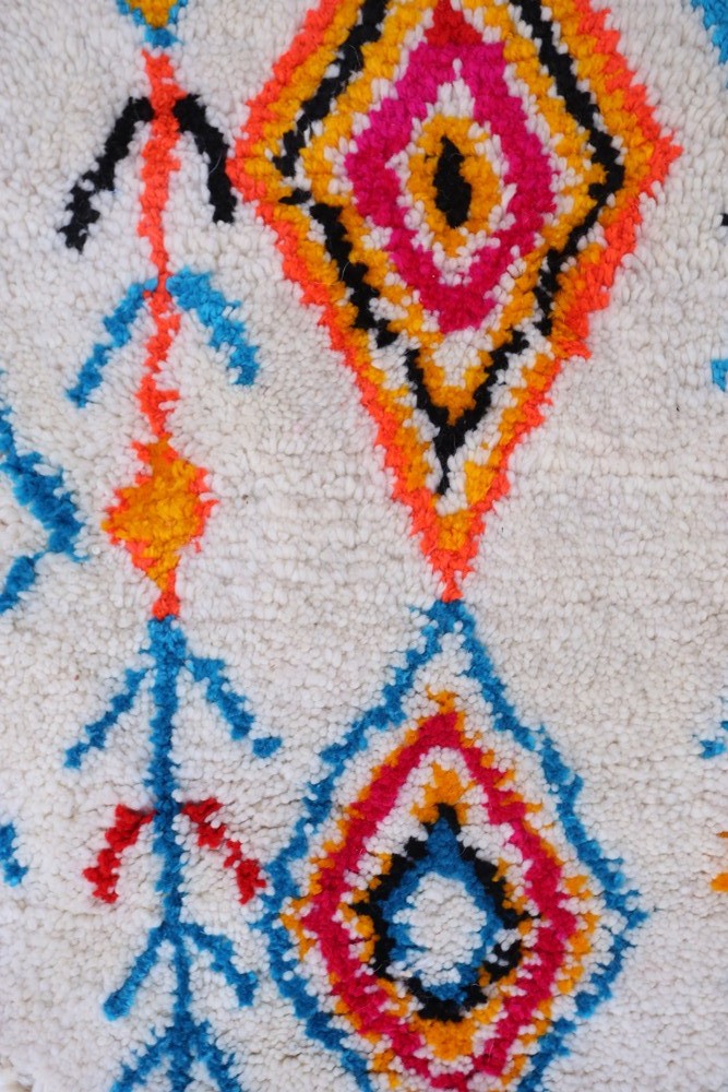 Esta alfombra bereber llamada Azilal recibe su nombre de la región de Azilal en Marruecos, donde ha sido confeccionada a mano en un telar tradicional de madera. Sus diseños representan los estados de ánimo, amores y penas de la tejedora en el momento de su creación. Una vez que se ha creado esta alfombra bereber de colores, ella creará otra totalmente diferente, dependiendo de sus emociones en ese momento. Cada pieza es única.