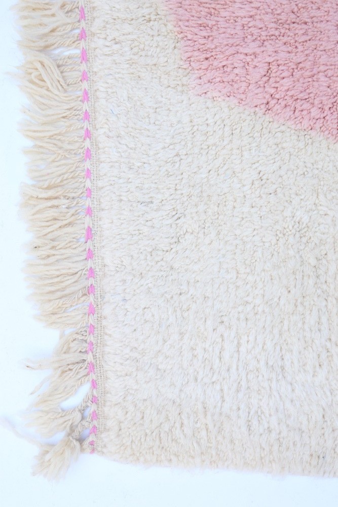 Gran alfombra bereber Azilal moderna en blanco con toques de color rosa.