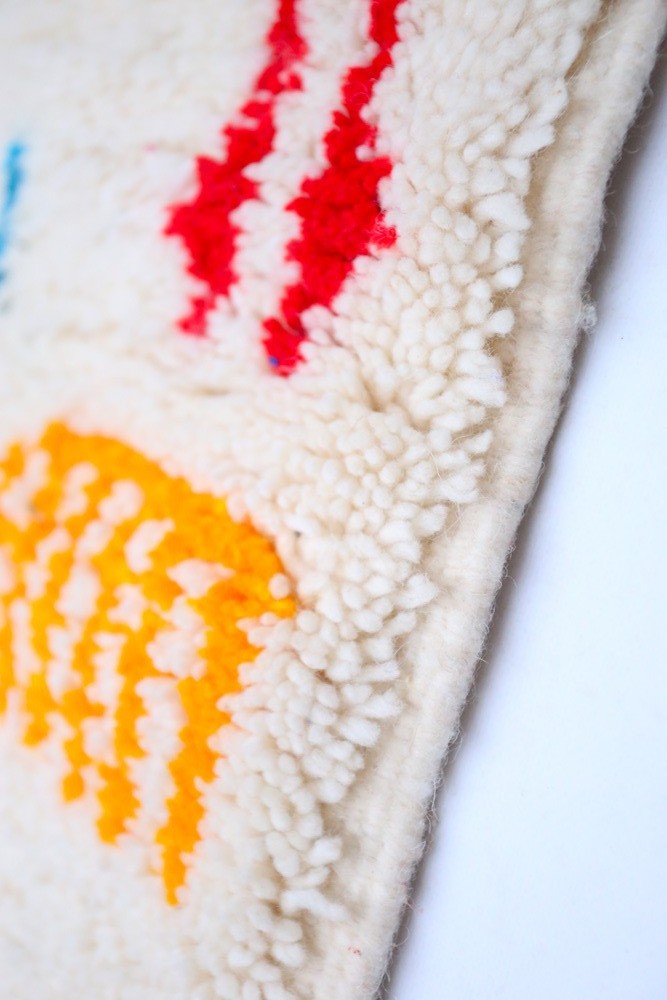 Esta alfombra bereber llamada Azilal recibe su nombre de la región de Azilal en Marruecos, donde fue confeccionada a mano en un telar tradicional de madera. Sus diseños representan los estados de ánimo, amores y penas de la tejedora en el momento de su creación. Una vez que se crea esta alfombra bereber colorida, ella creará otra completamente diferente, según sus emociones del momento. Cada pieza es única.