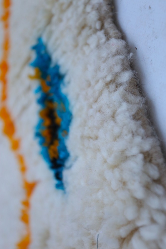 Esta alfombra bereber llamada Azilal recibe su nombre de la región de Azilal en Marruecos, donde ha sido confeccionada a mano en un telar tradicional de madera. Sus diseños representan los sentimientos, amores y penas de la tejedora en el momento de su creación. Una vez que se ha creado esta alfombra bereber colorida, ella creará otra totalmente diferente, según sus emociones del momento. Cada pieza es única.
