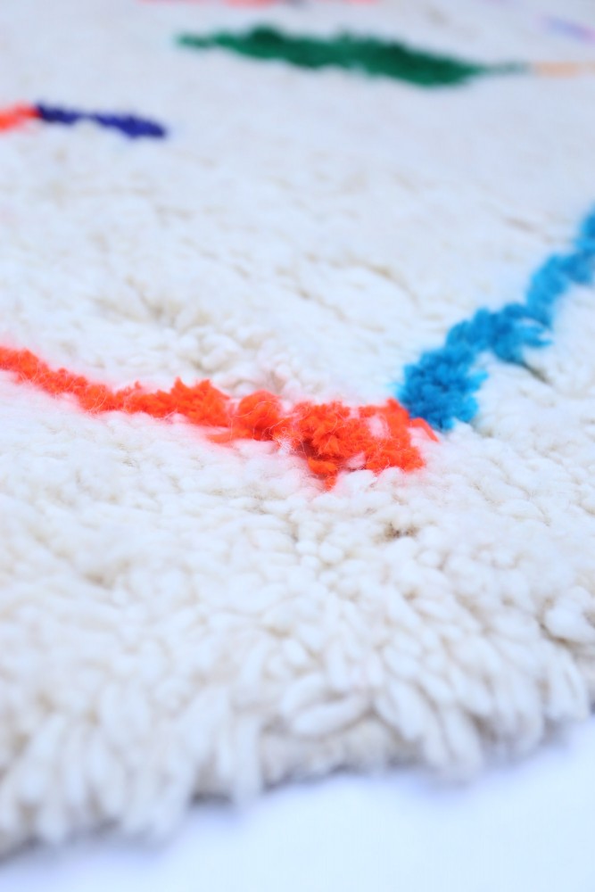 Esta alfombra bereber llamada Azilal recibe su nombre de la región de Azilal en Marruecos donde fue confeccionada a mano en un telar tradicional de madera. Sus diseños representan los estados de ánimo, amores y penas de la tejedora en el momento de su creación. Una vez creada esta alfombra bereber colorida, ella creará otra totalmente diferente, según sus emociones del momento. Cada pieza es única.