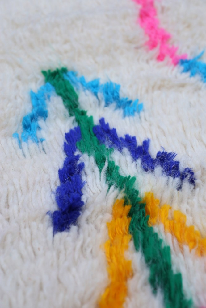 Esta alfombra bereber llamada Azilal recibe su nombre de la región de Azilal en Marruecos, donde fue confeccionada a mano en un telar tradicional de madera. Sus diseños representan los estados de ánimo, amores y penas de la tejedora en el momento de su creación. Una vez que se crea esta alfombra bereber de colores, ella creará otra totalmente diferente, según sus emociones del momento. Cada pieza es única.