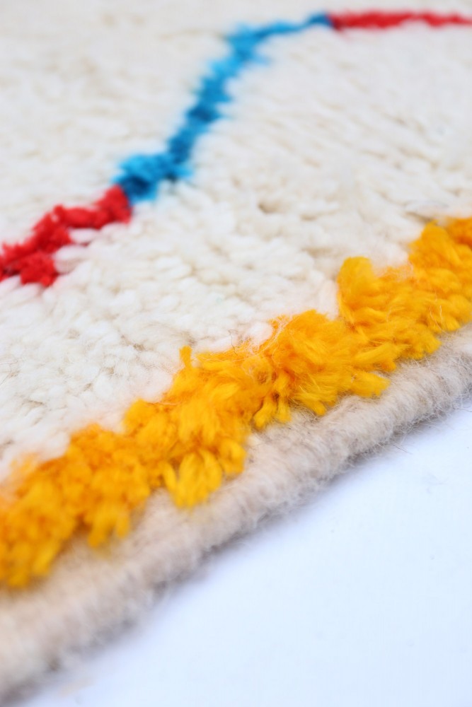 Esta alfombra bereber llamada Azilal recibe su nombre de la región de Azilal en Marruecos, donde ha sido confeccionada a mano en un telar tradicional de madera. Sus diseños representan los estados de ánimo, amores y penas de la tejedora en el momento de su creación. Una vez que se ha creado esta alfombra bereber de colores, ella creará otra totalmente diferente, dependiendo de sus emociones en ese momento. Cada pieza es única. Esta alfombra bereber representa más de un mes de tejido. Descubre en video cómo se crean las alfombras bereberes THEM haciendo clic aquí. Nuestras alfombras con un fondo blanco y diseños coloridos siempre tienen un fondo blanco de lana. Los colores pueden ser de algodón o lana. Los colores muy brillantes suelen ser de algodón y los colores con un aspecto más natural son de lana. Nuestras alfombras totalmente coloridas son 100% de lana. ENVÍO Todos los paquetes se envían desde Francia. No hay gastos de aduana para pedidos realizados en un país de la Unión Europea. Para pedidos fuera de la UE, pueden aplicarse gastos de aduana. Realizamos envíos a todo el mundo y todos los pedidos se envían cada 7 a 15 días. Para Francia: puedes elegir entre envío a punto de recogida con Mondial Relay o envío a domicilio con Colissimo. Para el resto del mundo: el costo del envío varía según el país. Simplemente agrega la alfombra al carrito, ingresa tu dirección y se te indicará el costo exacto del envío. DEVOLUCIÓN Tienes un plazo de 14 días a partir de la entrega de tu paquete para solicitar un cambio, un crédito o un reembolso. Para Francia: - Si deseas un cambio/crédito: todo es gratuito (la devolución y el envío del nuevo paquete corren por nuestra cuenta) - Si deseas un reembolso: los gastos de devolución corren por tu cuenta Para el resto del mundo: - Si deseas un cambio: los gastos de devolución corren por tu cuenta y el envío del nuevo paquete corre por nuestra cuenta - Si deseas un reembolso: los gastos de devolución corren por tu cuenta Sorprendentemente, las alfombras bereberes se cuidan fácilmente. Hay que tener en cuenta que estas piezas cargadas de historia no tienen como objetivo principal ser un objeto decorativo. Las mujeres bereberes las tejen y las utilizan como cobertor o alfombra para aislamiento. La calidad excepcional del tejido permite que las alfombras bereberes se mantengan con el tiempo y envejezcan muy bien. Para su cuidado, puedes pasar la aspiradora sobre ella una vez por semana como máximo para no dañar la lana. Si no puedes sacudirla, dale la vuelta durante unas horas una vez al mes, todas las partículas de polvo caerán en profundidad. En caso de mancha, simplemente golpea con un paño húmedo, a menudo es suficiente. De lo contrario, agrega vinagre de alcohol o jabón de Marsella con mucha agua.Más información