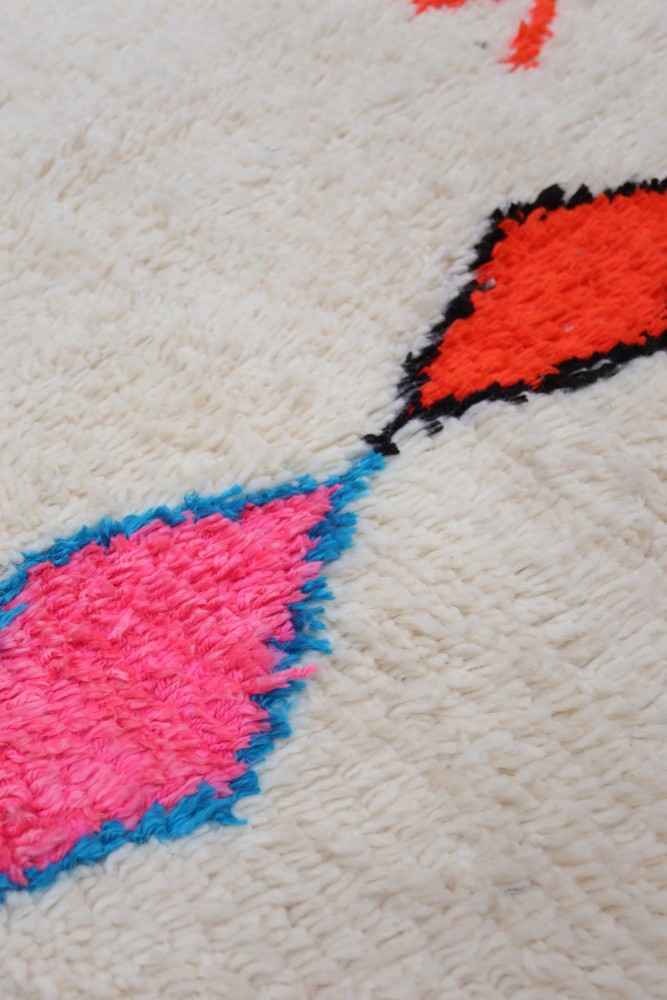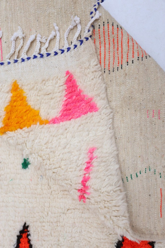 Esta alfombra bereber llamada Azilal recibe su nombre de la región de Azilal en Marruecos, donde ha sido confeccionada a mano en un telar tradicional de madera. Sus diseños representan los estados de ánimo, amores y penas de la tejedora en el momento de su creación. Una vez que se ha creado esta alfombra bereber de colores, ella creará otra totalmente diferente, dependiendo de sus emociones en ese momento. Cada pieza es única.