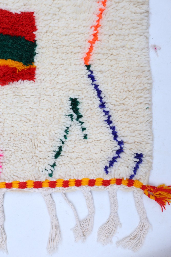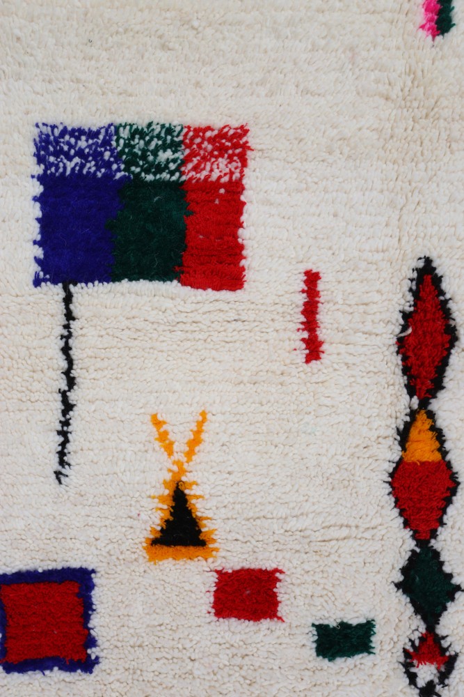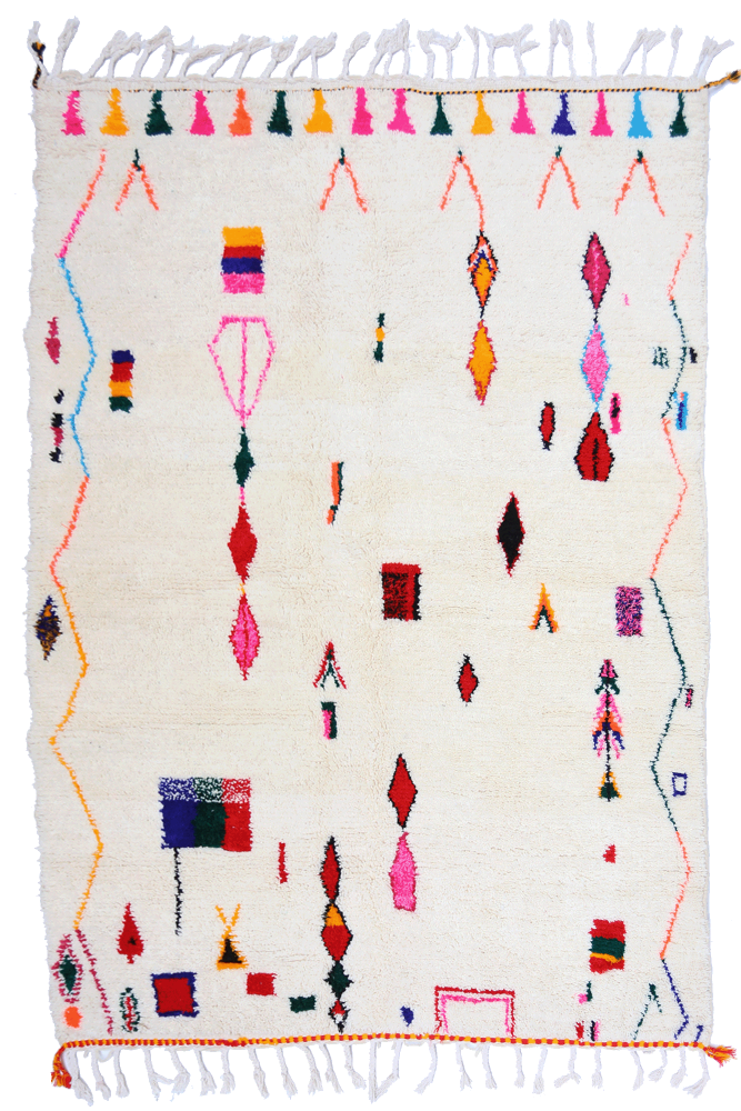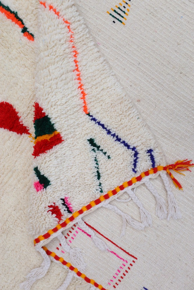 Esta alfombra bereber llamada Azilal recibe su nombre de la región de Azilal en Marruecos, donde ha sido confeccionada a mano en un telar tradicional de madera. Sus diseños representan los estados de ánimo, amores y penas de la tejedora en el momento de su creación. Una vez que se ha creado esta alfombra bereber de colores, ella creará otra totalmente diferente, dependiendo de sus emociones en ese momento. Cada pieza es única.