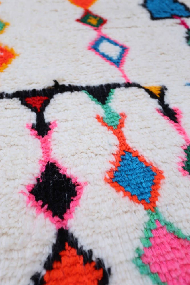 Esta alfombra bereber llamada Azilal recibe su nombre de la región de Azilal en Marruecos, donde ha sido confeccionada a mano en un telar tradicional de madera. Sus diseños representan los estados de ánimo, amores y penas de la tejedora en el momento de su creación. Una vez que se ha creado esta alfombra bereber de colores, ella creará otra totalmente diferente, dependiendo de sus emociones en ese momento. Cada pieza es única.
