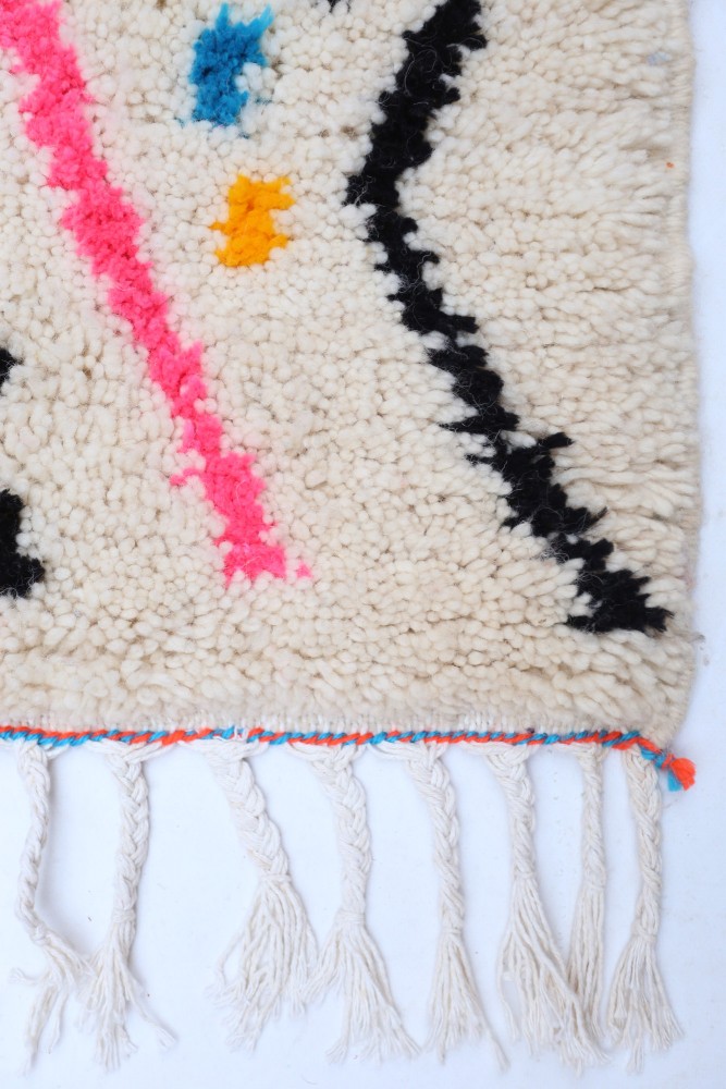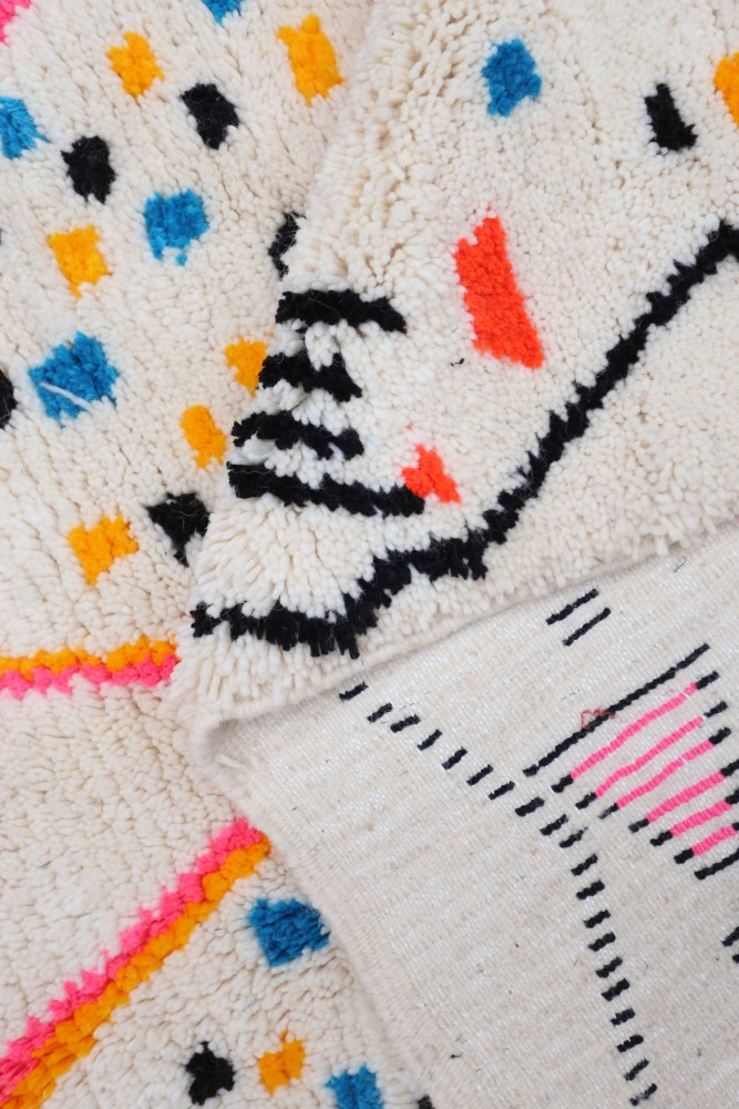 Esta alfombra bereber llamada Azilal recibe su nombre de la región de Azilal en Marruecos, donde ha sido confeccionada a mano en un telar tradicional de madera. Sus diseños representan los estados de ánimo, amores y penas de la tejedora en el momento de su creación. Una vez que se ha creado esta alfombra bereber de colores, ella creará otra totalmente diferente, dependiendo de sus emociones en ese momento. Cada pieza es única.