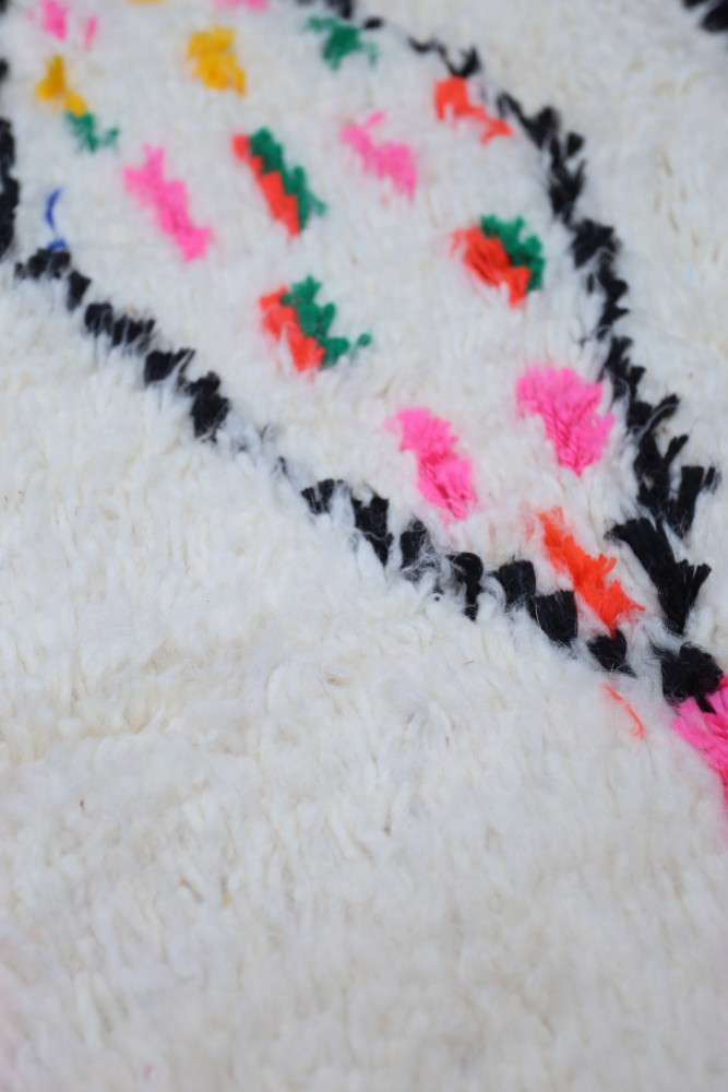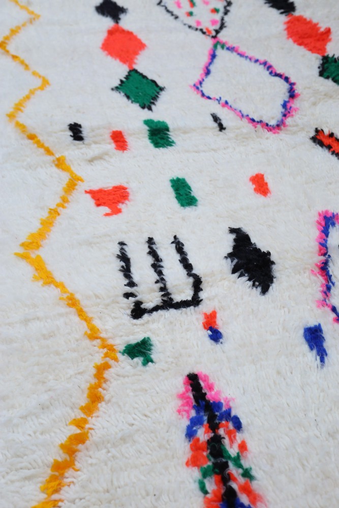 Esta alfombra bereber llamada Azilal recibe su nombre de la región de Azilal en Marruecos, donde ha sido confeccionada a mano en un telar tradicional de madera. Sus diseños representan los estados de ánimo, amores y penas de la tejedora en el momento de su creación. Una vez que se ha creado esta alfombra bereber de colores, ella creará otra totalmente diferente, dependiendo de sus emociones en ese momento. Cada pieza es única.