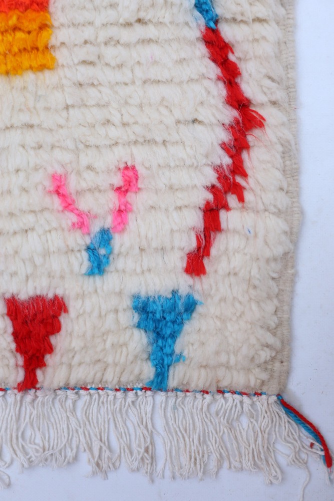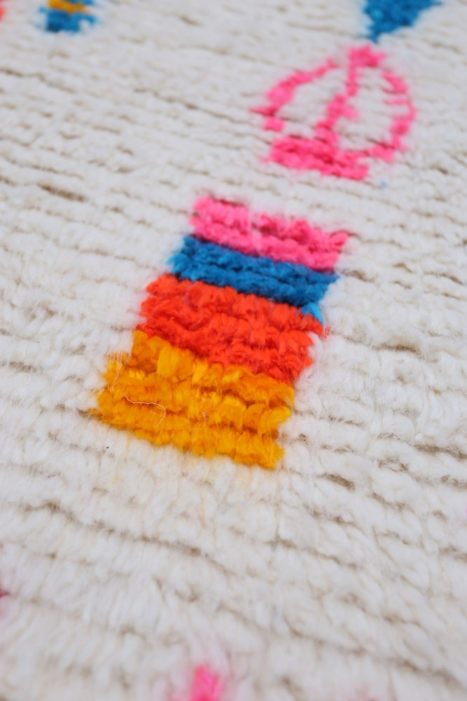 Esta alfombra bereber llamada Azilal recibe su nombre de la región de Azilal en Marruecos, donde ha sido confeccionada a mano en un telar tradicional de madera. Sus diseños representan los estados de ánimo, amores y penas de la tejedora en el momento de su creación. Una vez que se ha creado esta alfombra bereber de colores, ella creará otra totalmente diferente, dependiendo de sus emociones en ese momento. Cada pieza es única. Esta alfombra bereber representa más de un mes de tejido. Descubre en video cómo se crean las alfombras bereberes THEM haciendo clic aquí. Nuestras alfombras con un fondo blanco y diseños coloridos siempre tienen un fondo blanco de lana. Los colores pueden ser de algodón o lana. Los colores muy brillantes suelen ser de algodón y los colores con un aspecto más natural son de lana. Nuestras alfombras totalmente coloridas son 100% de lana. ENVÍO Todos los paquetes se envían desde Francia. No hay gastos de aduana para pedidos realizados en un país de la Unión Europea. Para pedidos fuera de la UE, pueden aplicarse gastos de aduana. Realizamos envíos a todo el mundo y todos los pedidos se envían cada 7 a 15 días. Para Francia: puedes elegir entre envío a punto de recogida con Mondial Relay o envío a domicilio con Colissimo. Para el resto del mundo: el costo del envío varía según el país. Simplemente agrega la alfombra al carrito, ingresa tu dirección y se te indicará el costo exacto del envío. DEVOLUCIÓN Tienes un plazo de 14 días a partir de la entrega de tu paquete para solicitar un cambio, un crédito o un reembolso. Para Francia: - Si deseas un cambio/crédito: todo es gratuito (la devolución y el envío del nuevo paquete corren por nuestra cuenta) - Si deseas un reembolso: los gastos de devolución corren por tu cuenta Para el resto del mundo: - Si deseas un cambio: los gastos de devolución corren por tu cuenta y el envío del nuevo paquete corre por nuestra cuenta - Si deseas un reembolso: los gastos de devolución corren por tu cuenta Sorprendentemente, las alfombras bereberes se cuidan fácilmente. Hay que tener en cuenta que estas piezas cargadas de historia no tienen como objetivo principal ser un objeto decorativo. Las mujeres bereberes las tejen y las utilizan como cobertor o alfombra para aislamiento. La calidad excepcional del tejido permite que las alfombras bereberes se mantengan con el tiempo y envejezcan muy bien. Para su cuidado, puedes pasar la aspiradora sobre ella una vez por semana como máximo para no dañar la lana. Si no puedes sacudirla, dale la vuelta durante unas horas una vez al mes, todas las partículas de polvo caerán en profundidad. En caso de mancha, simplemente golpea con un paño húmedo, a menudo es suficiente. De lo contrario, agrega vinagre de alcohol o jabón de Marsella con mucha agua.Más información